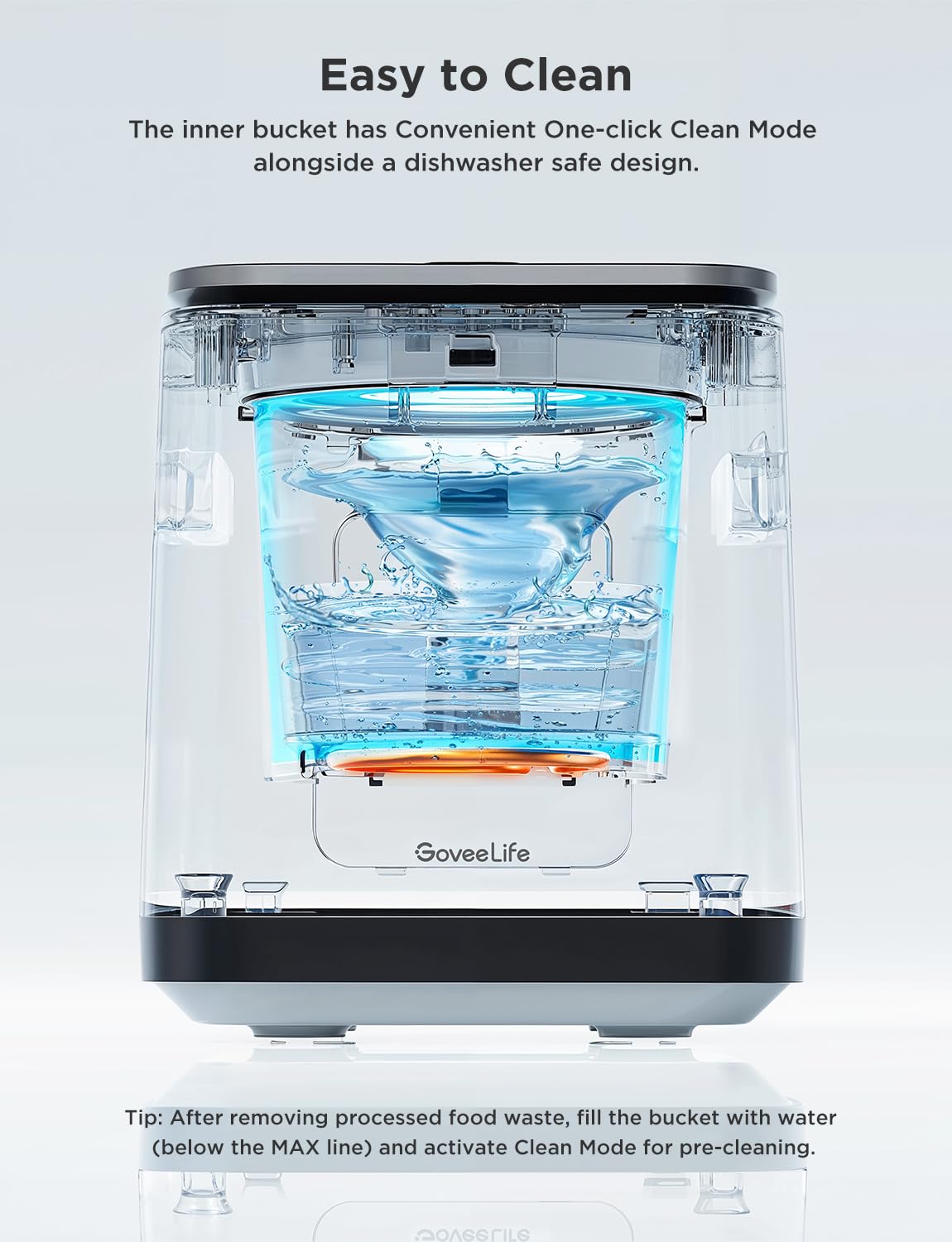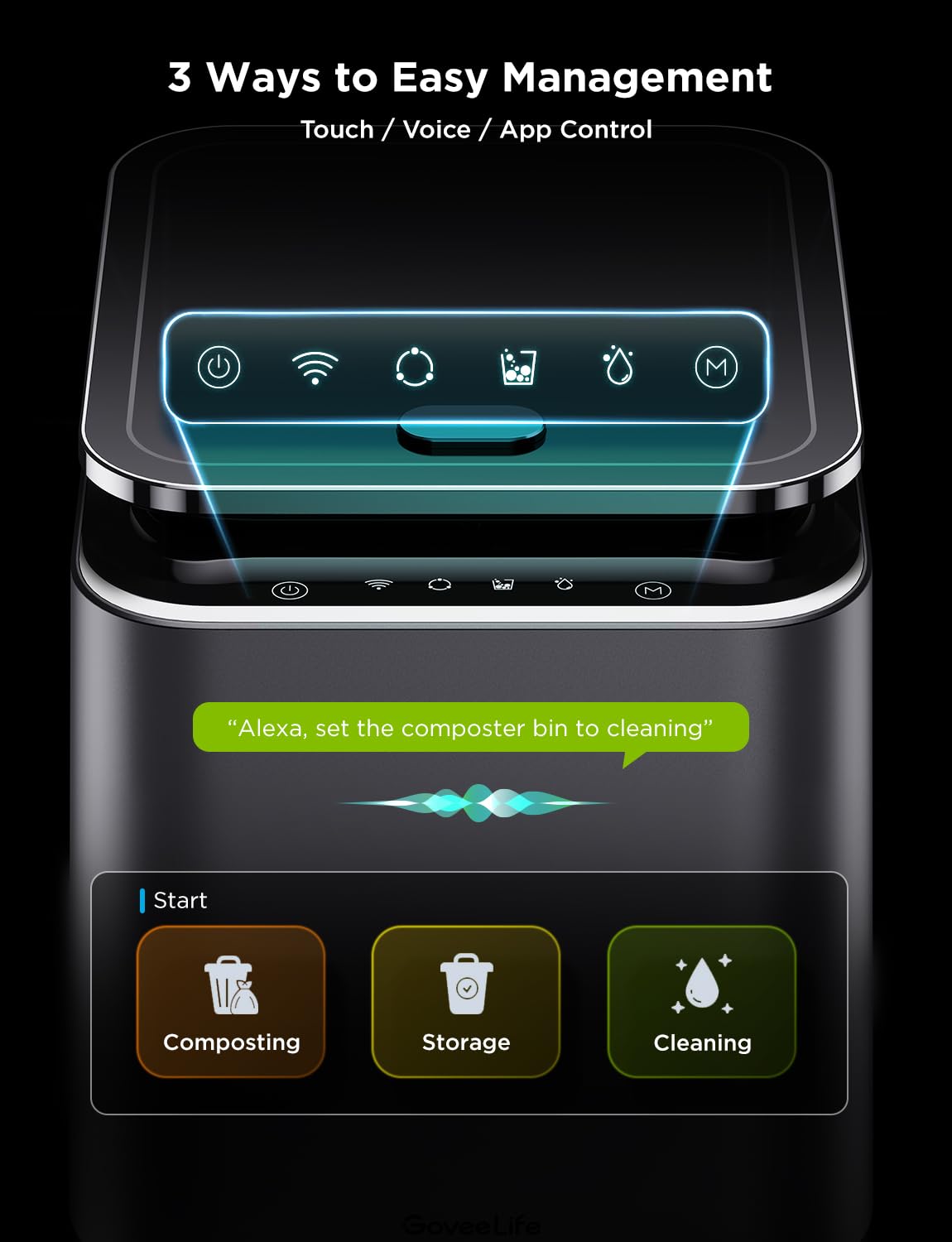 Smart Composter Bin with App: You could create a composter schedule and monitor the status via the app from everywhere, Goveelife Smart Kitchen Composter saves your time and consumes less energy too.Compatible with Alexa, Google Assistant, and Siri.