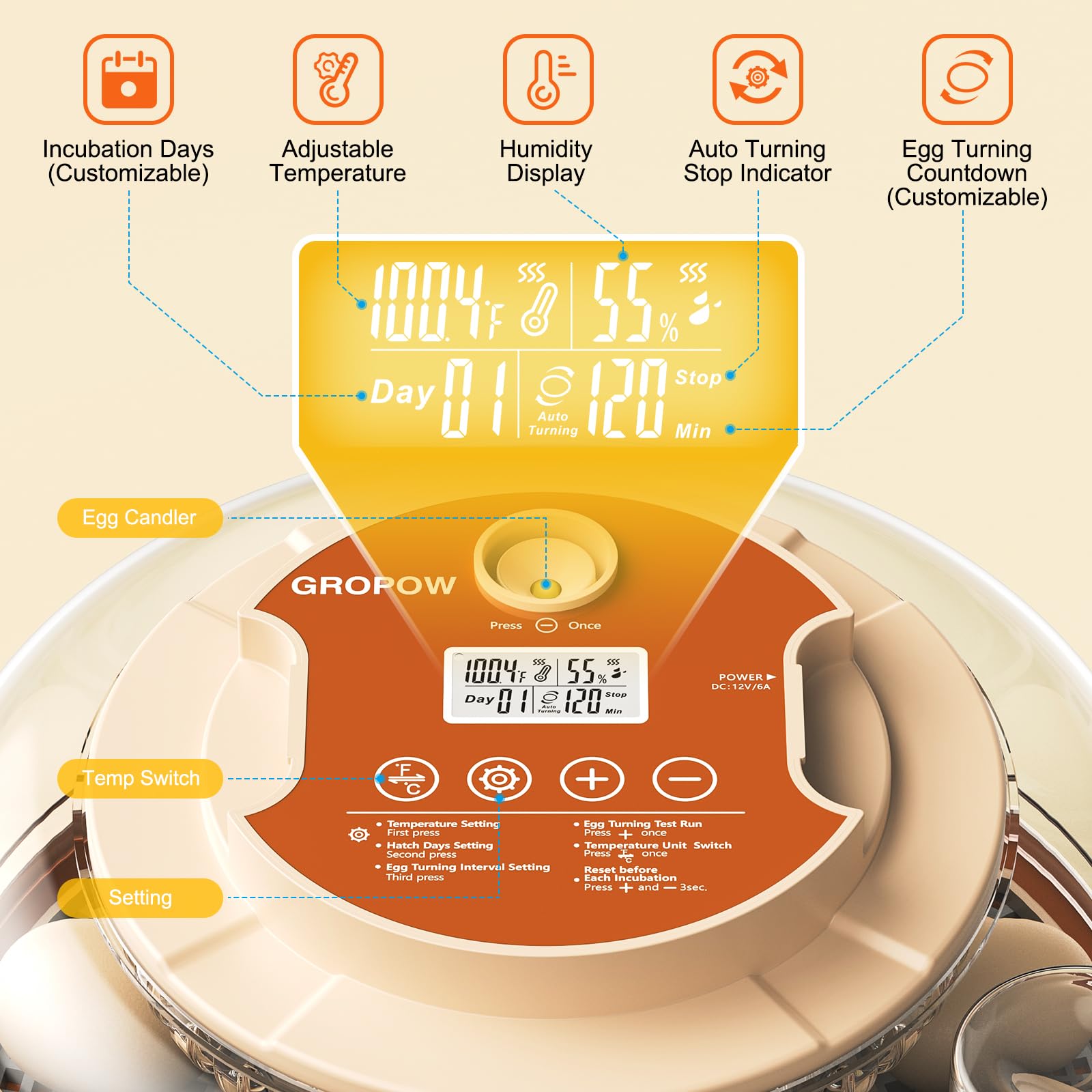 GROPOW 18 Egg Incubator, Automatic Turning with Temperature & Humidity Control, Egg Candler, 360 View with Air Vent, Auto Water Bottle Refill, Chicken Incubator for Hatching Eggs