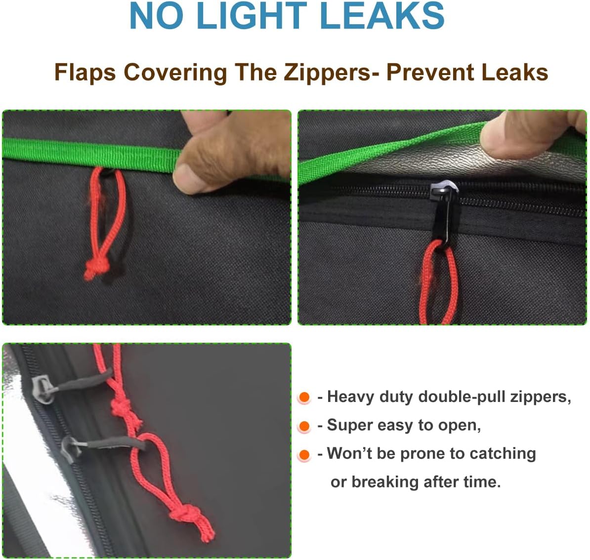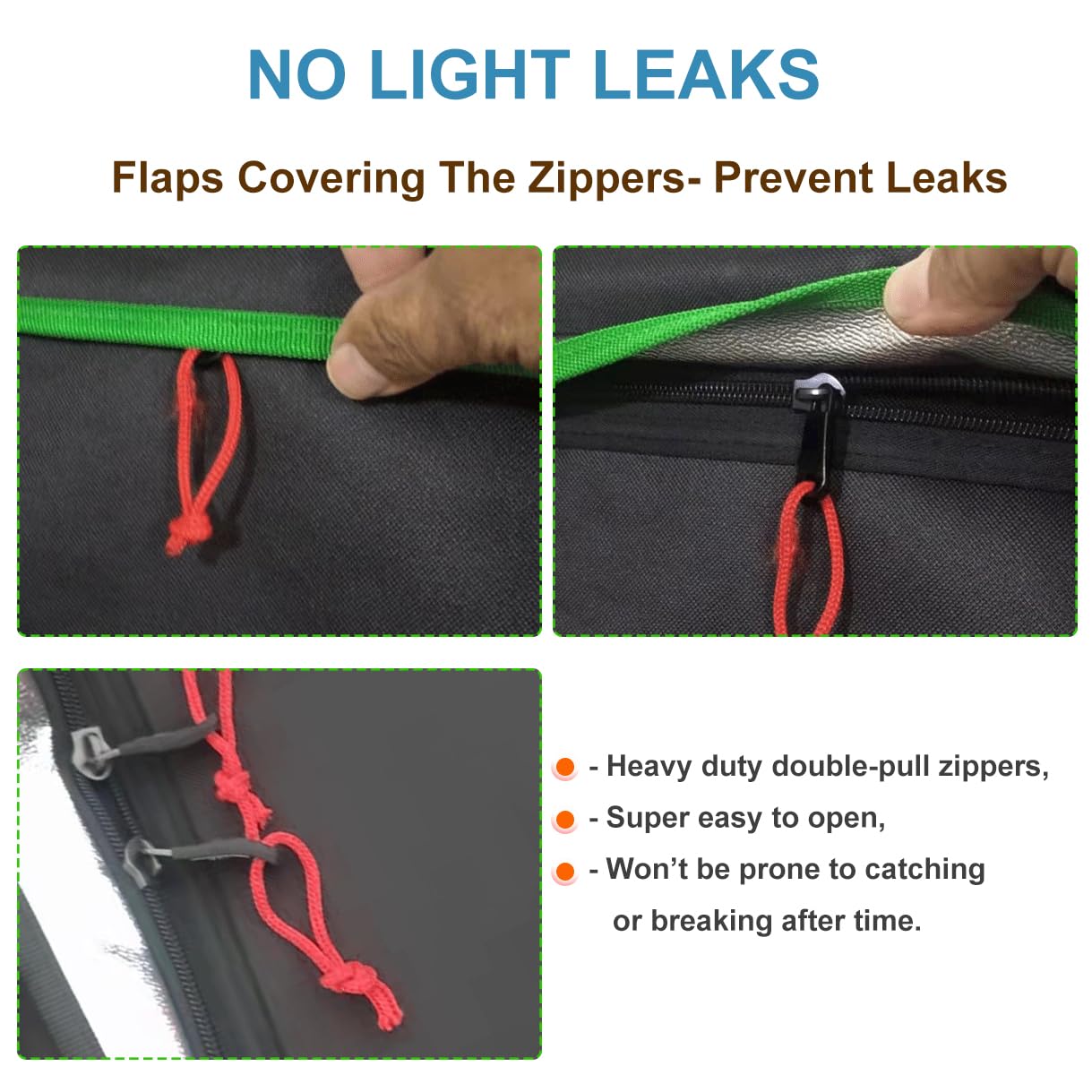 ★【NO Light Leaks Hydroponic Grow Tent 】Superior light blocking;Heavy duty exterior and interior material; Heavy duty double-pull zippers-easy to open and aren’t prone to catching or breaking after time; Feathers flaps covering the zippers-helps prevent leaks- make a completely opaque grow tent; blocks ambient light from entering, and system light from exiting