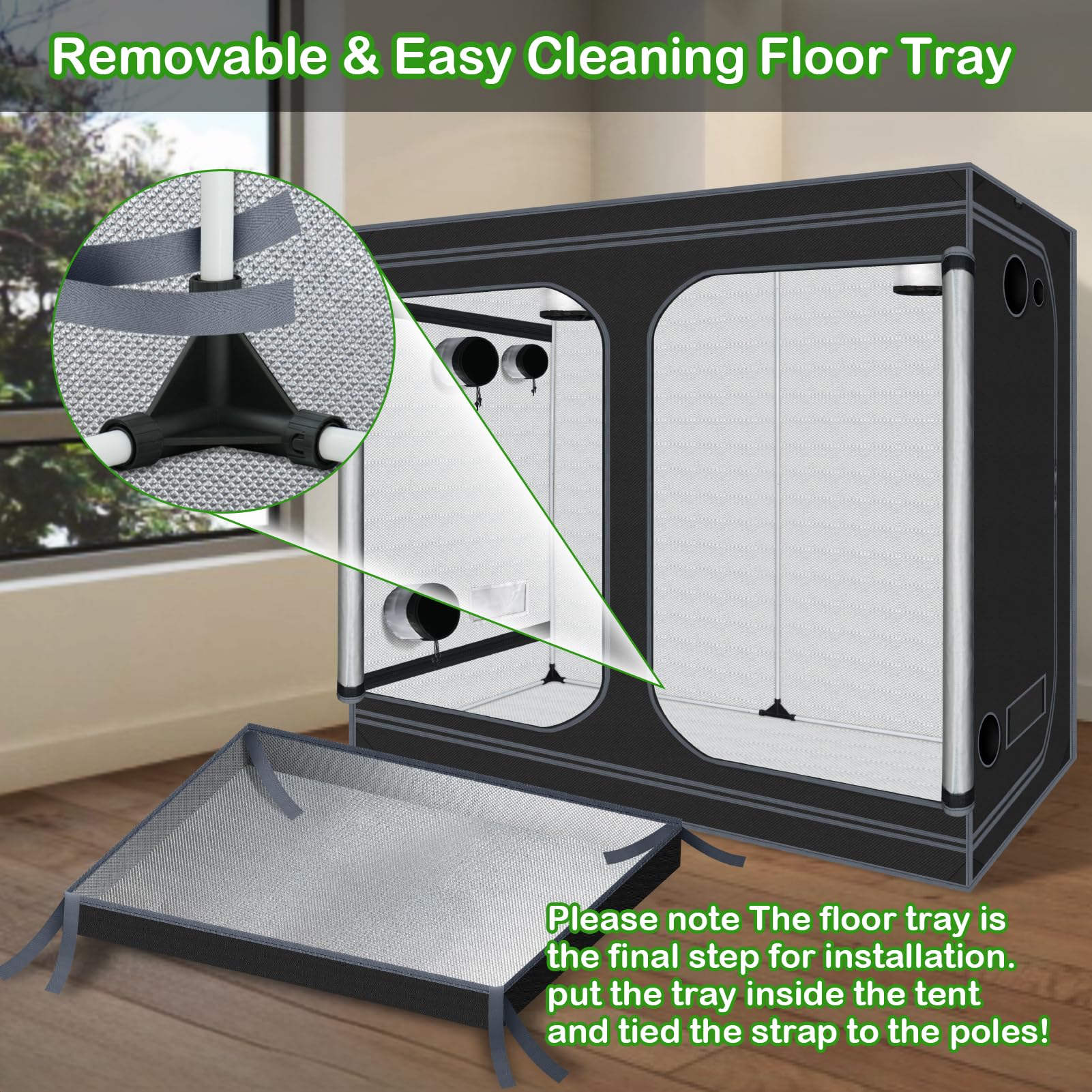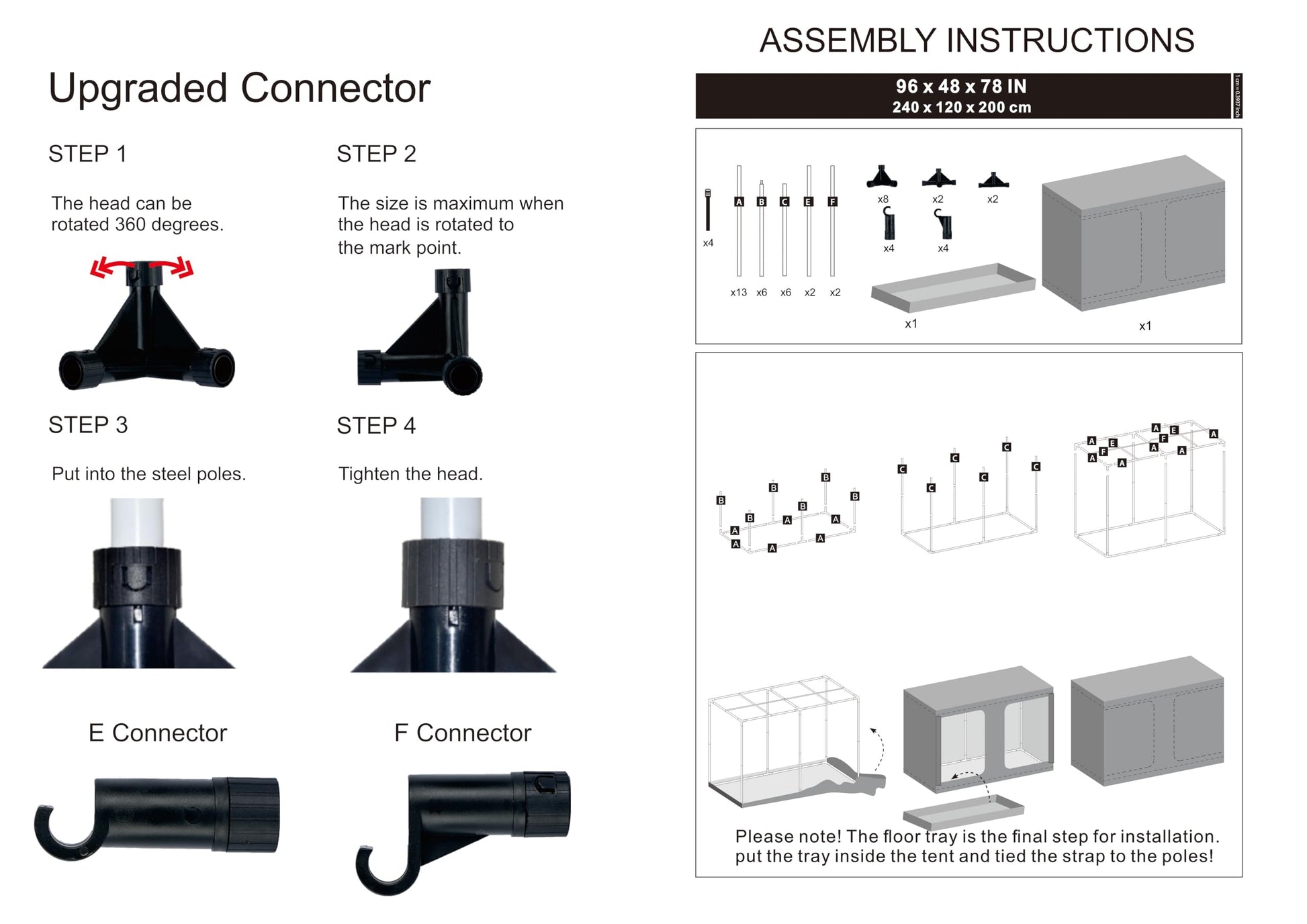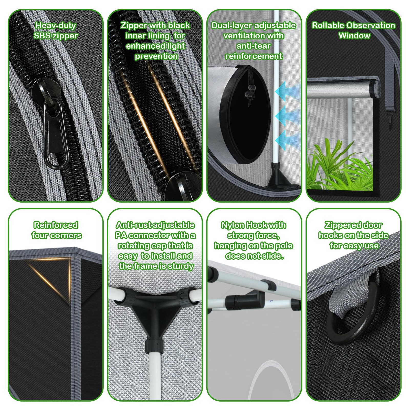 Upgrade Design --- UPGRADED CONNECTOR--Durable PA Material Adopted, Anti-rust Reinforced Design, Adjustable Tightness According to The Pole, Hold Poles Tightly for Firmed Support. Multiple vents to accommodate fans and filter; ducting rectangle window with mesh to keep dust and insects out; Removable mylar floor tray easy to clean.