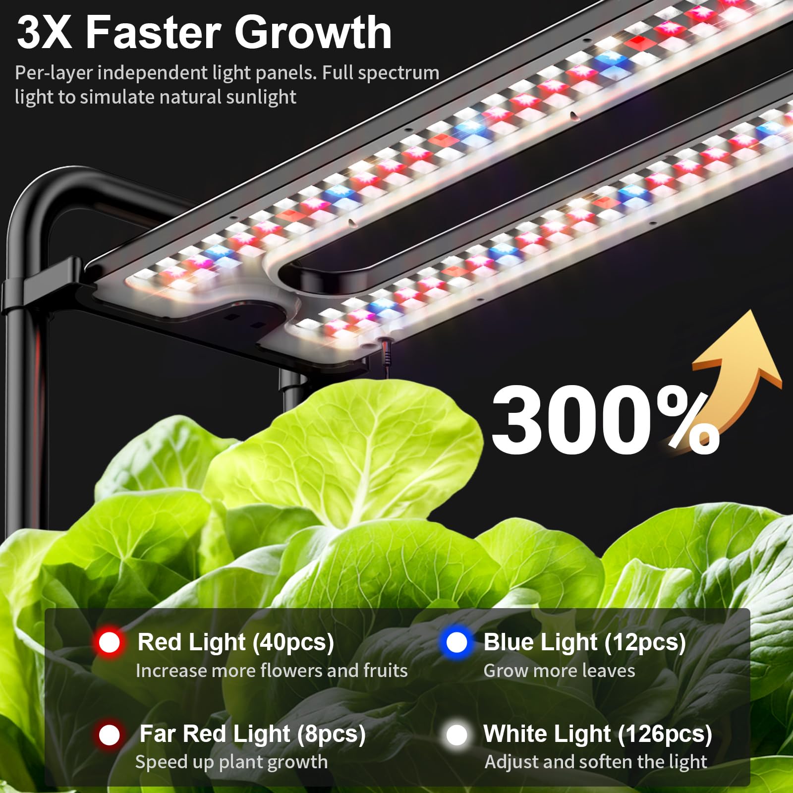 Full Spectrum Lighting & Adjustable Height: Our indoor hydroponic garden is equipped with 64w (16w*4) full spectrum lighting to simulate natural sunlight, accelerate photosynthesis, and make plants grow up to 3 times faster than in soil. The light panel height is easily adjustable, providing tailored illumination for both short greens and tall plants to maximize growth.