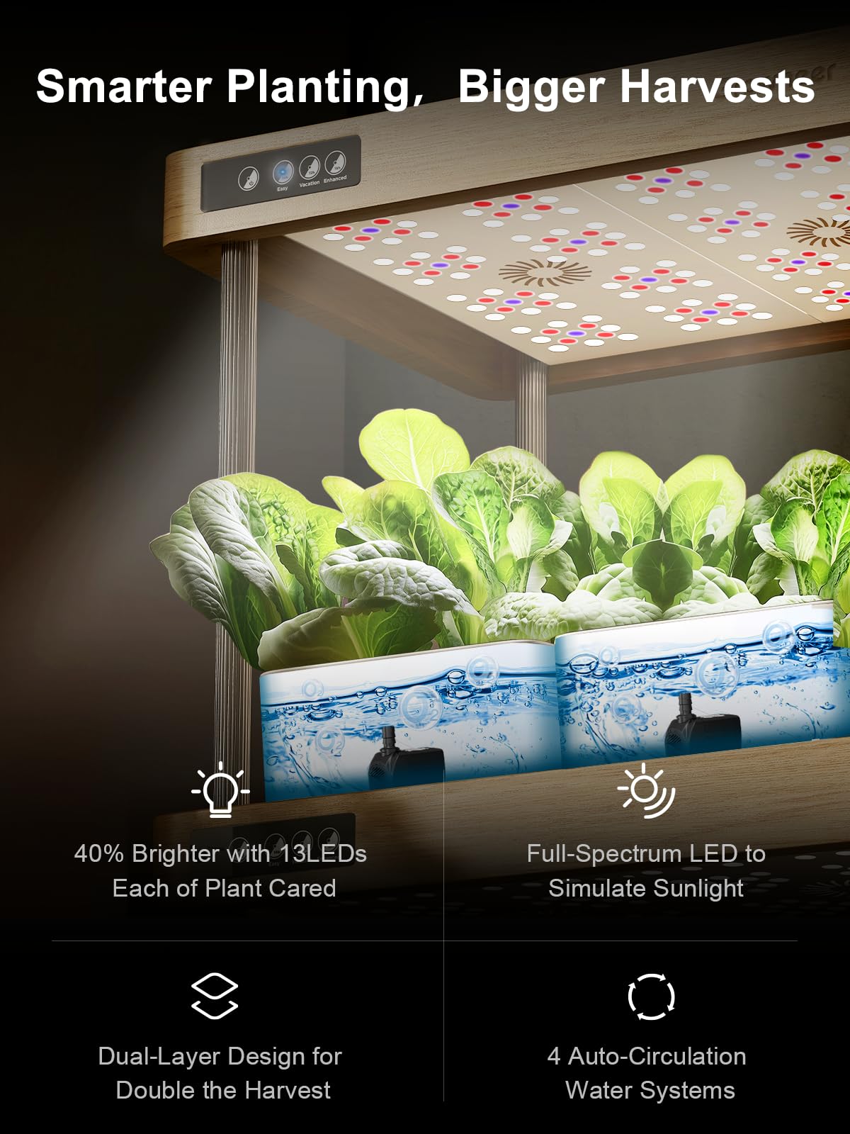 DUAL-LAYER 4-ZONE INDEPENDENT CIRCULATION DESIGN - The system features four water tanks and smart, silent pumps that enable automatic water circulation, boosting oxygen levels and ensuring even nutrient distribution to plant roots. Independent zones provide tailored water and nutrient supplies for each area, meeting diverse plant needs while enhancing system efficiency and yield.