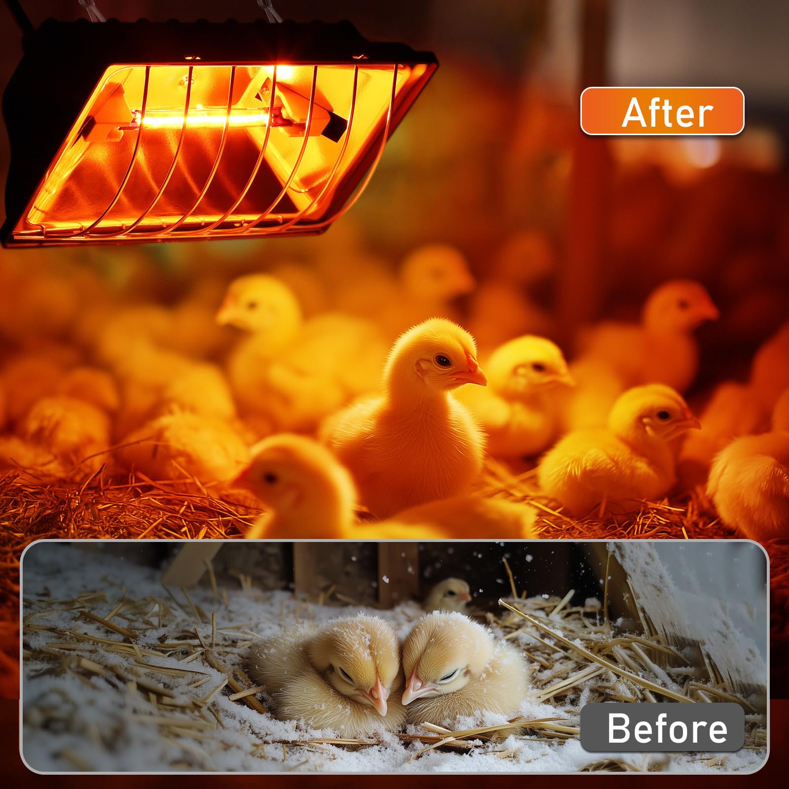 【Safe & Durable】-- This brooder heater is made of high-strength AD12 aluminium. Heavy-duty metal mesh prevents damage to bulbs and animals. Our chicken coop heater power cord has gotten international UL certification, which is safe to use for your small animals, pet poultry, reptiles, and amphibians