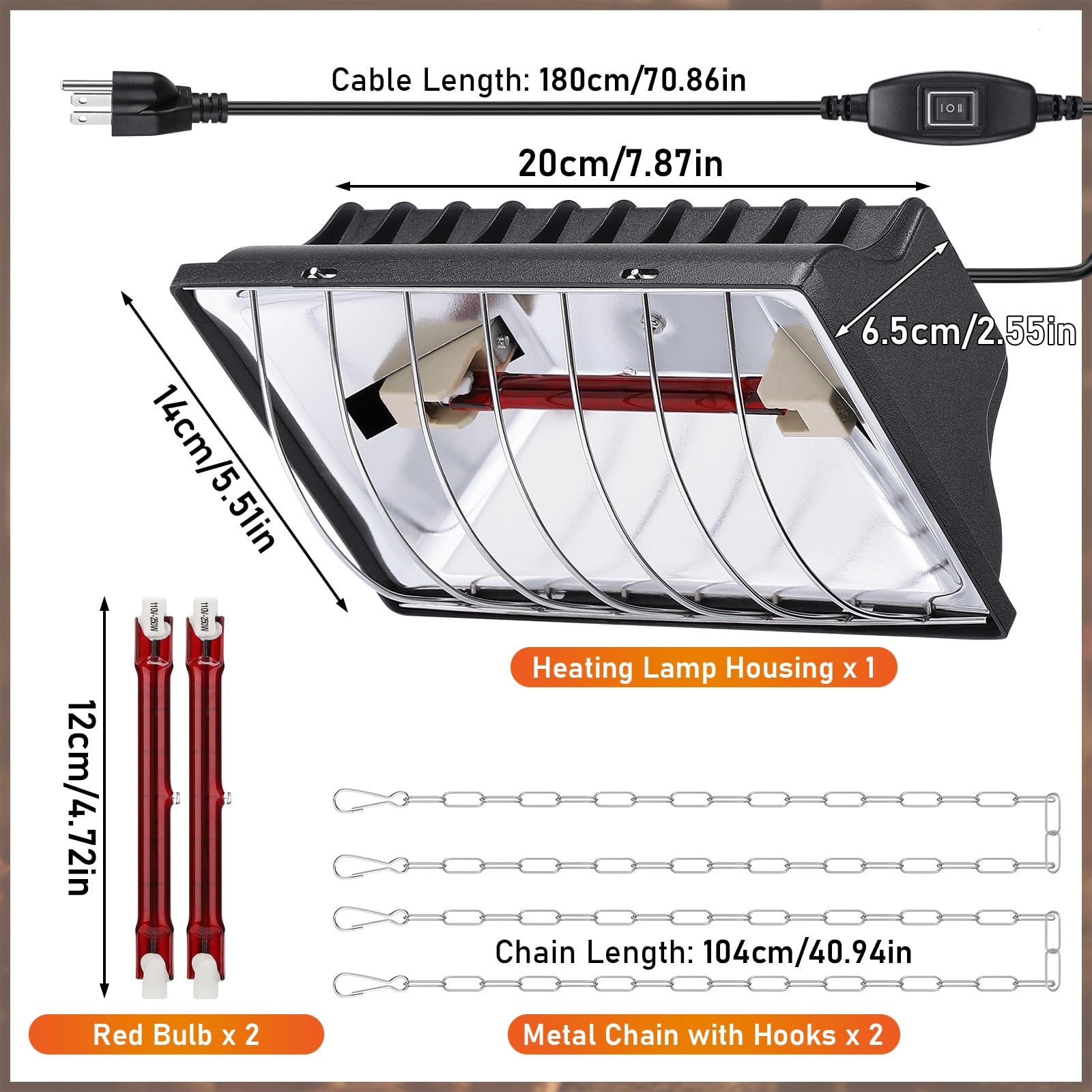 【Easy to Install & Use】-- The package includes 2 x chain with hooks, 2 x 250W red bulb and 1x lamp cover. Our chicken coop heater has a metal hanging wire connected to a hook, no need to drill holes on the wall, it can be easily hung using the hook. Besides, the lamp plate is very easy to use, just plug it in and turn on the switch to use it