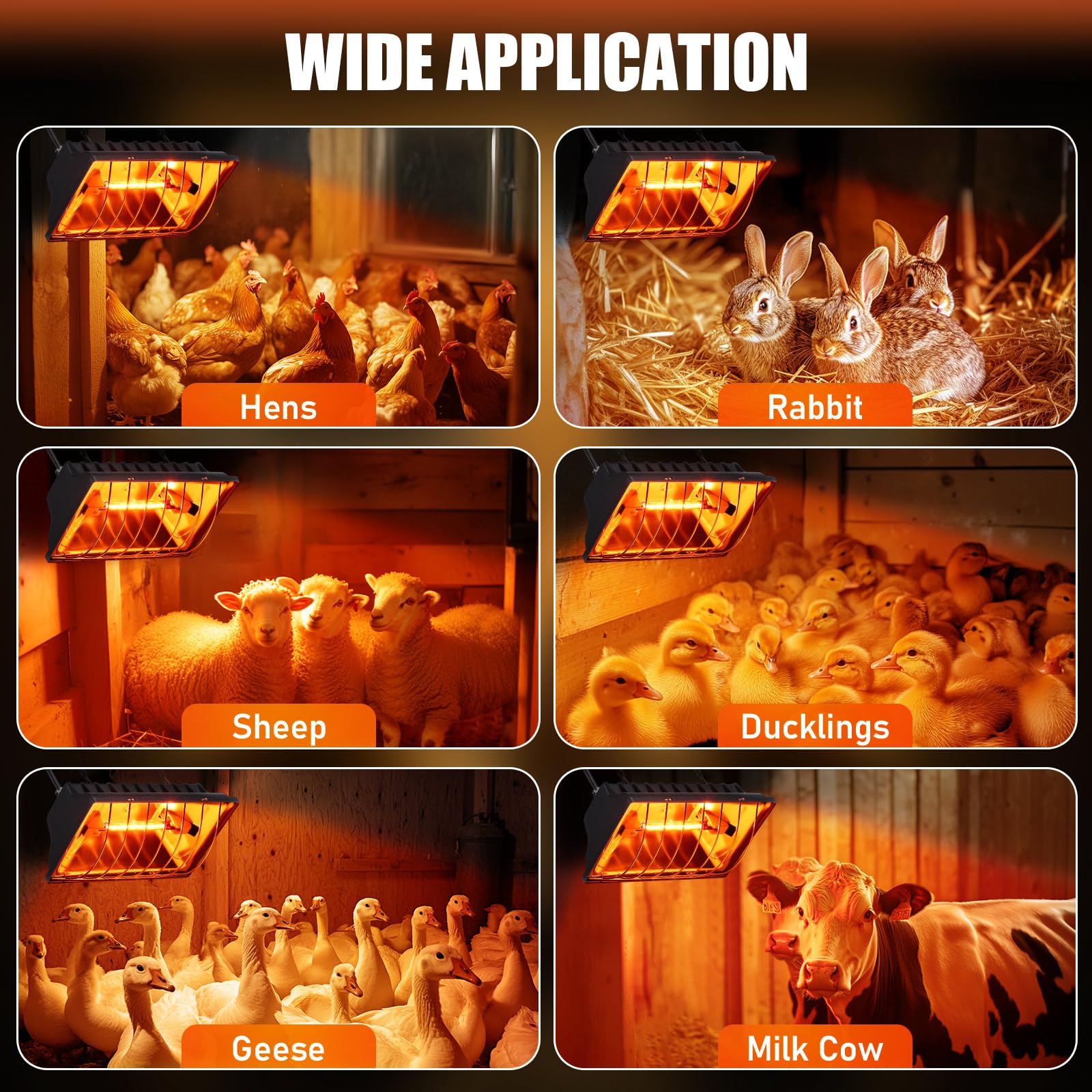 【Versatile & Multiple】-- The brooder lamps heater provides excellent directional heating for the coop. Sturdy and reliable heat lamp for warming lambs, goats, chickens, ducks, puppies or any sick or cold animal. Can be used as a heat source for livestock and poultry brooders, laying enclosures and feeders
