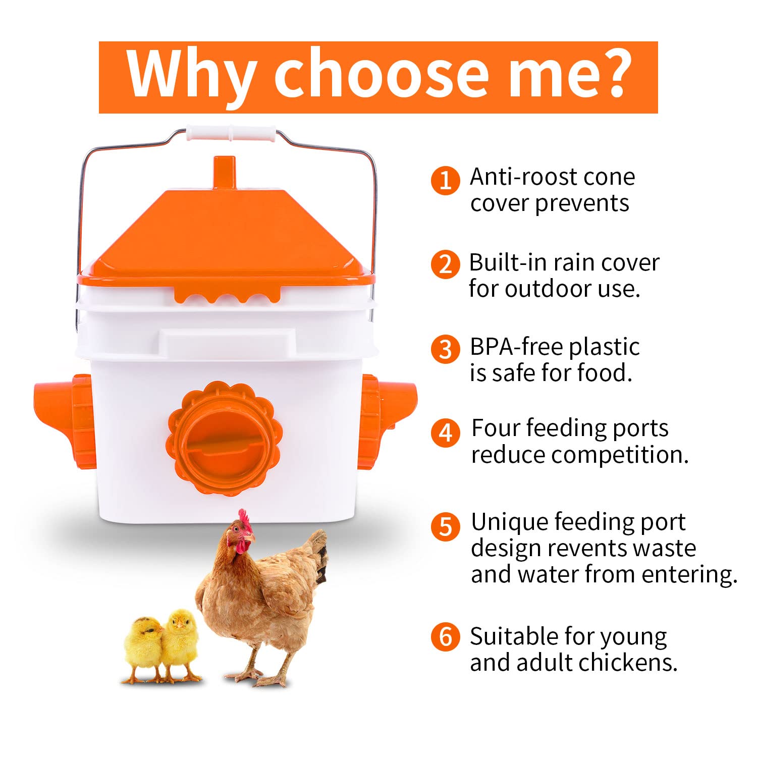 Anti-Roost Cone Keeps Chickens From Jumping On The Bucket And Dirtying The Feed:Ensuring It Stays Clean And Hygienic. Plus, The Rainproof Design Protects The Feed From Wet Weather, Making It Ideal For Year-Round Use.