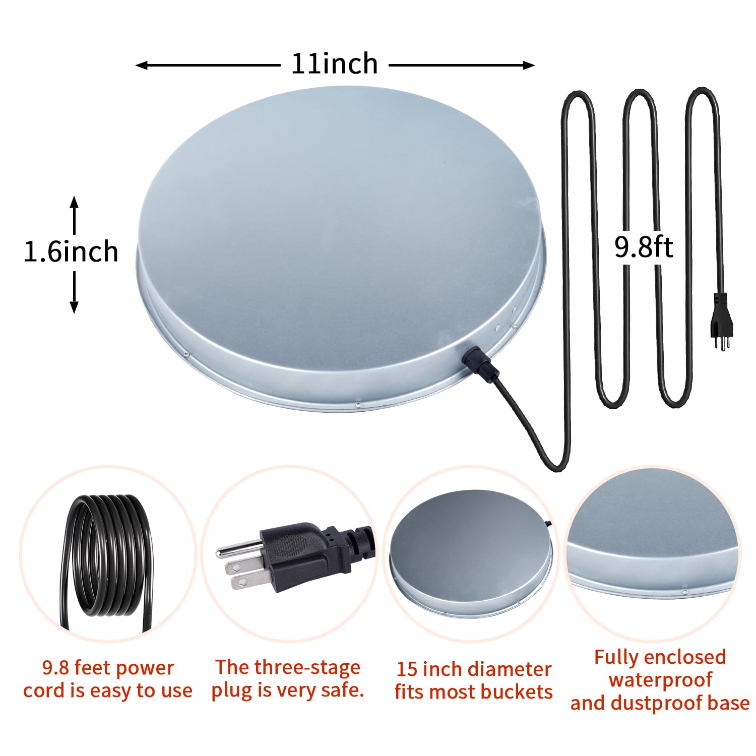 • Heated Chicken Waterer: Large Chicken Water Heater, with a Diameter of 11 Inches, Suitable for Most Water Buckets, Including 3-Gallon Feed Buckets. The Power Cord is 9.8 Feet Long, Which Is Sufficient for Your Use. The Chicken Water Heaters Are Also Equipped with a Three-Prong Plug for Safe Usage.
