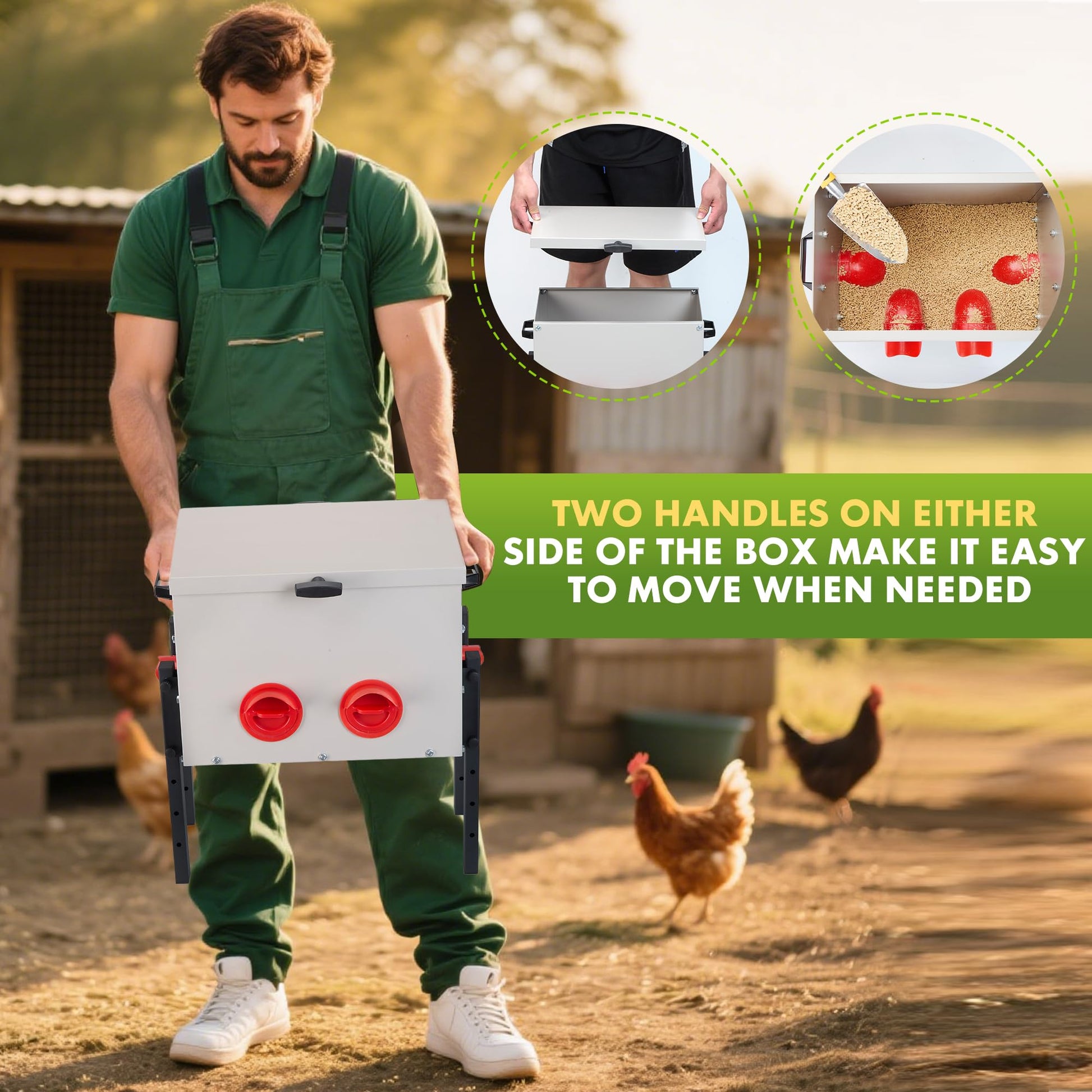 ULTRA LARGE CAPACITY DESIGN:Specially designed for efficient chicken farming, the galvanized metal feed box can easily hold 30 pounds of feed, reducing the hassle of frequent feeding.