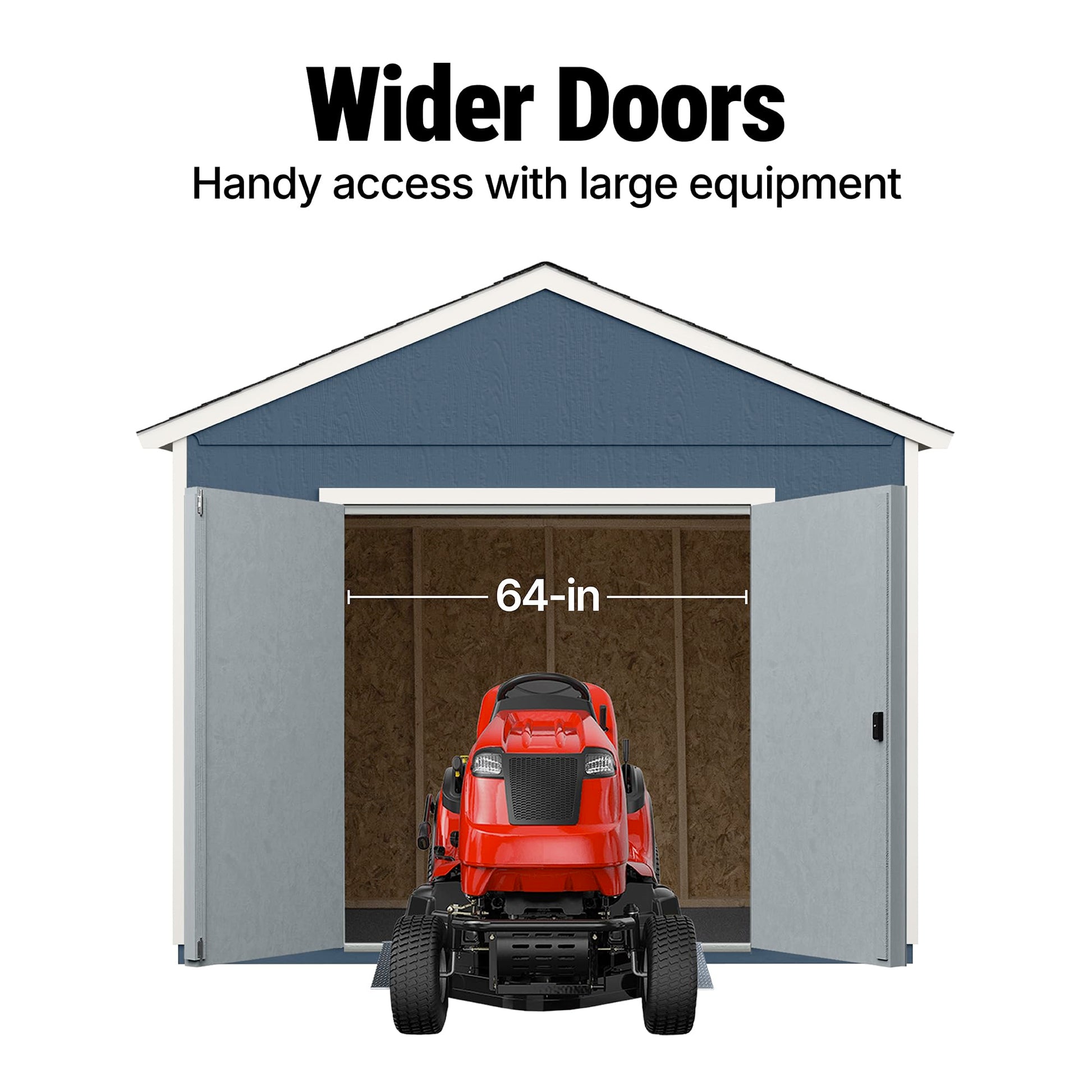 • 7’ tall side walls / 9’-6” peak height provides convenient vertical storage for ladders, rakes, shovels and more; Extra-large 5’-4” wide doors feature continuous galvanized steel hinges