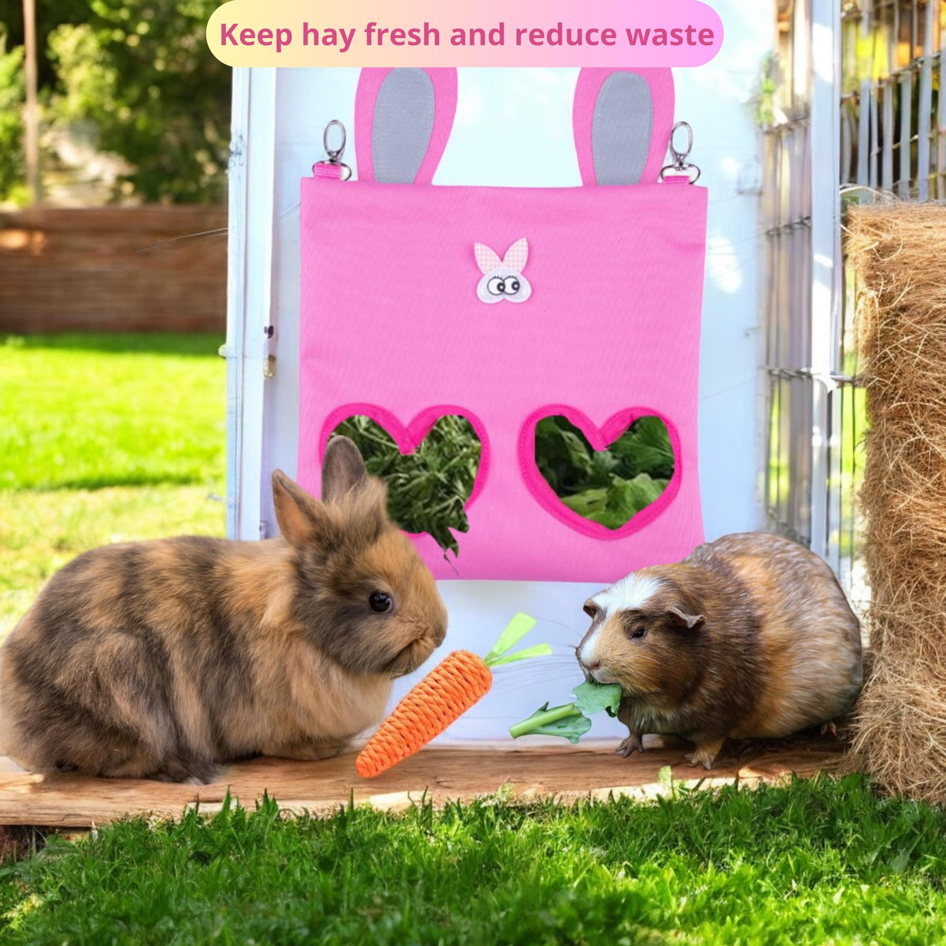 Keep hay fresh and reduce waste: The spacious 14.17 x 9.84 x 9.84-inch hay feeder bags, hay bag for rabbits, rabbit hay feeder, guinea pig hay feed ensures your bunny has an ample supply of fresh hay and fully loaded. The two feeding heart-shaped holes and the hook items of rabbit hay bag products prevent hay from being scattered around the guinea pig cages, rabbit cage, chinchilla cage and minimize waste.