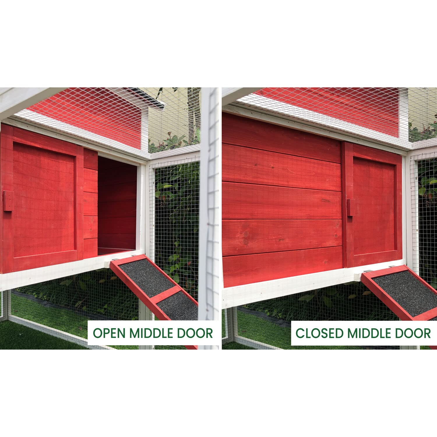 Access Door: An access door allows your hens to go down the non-slip ramp into the large outdoor enclosure to roam and play on the grass underneath