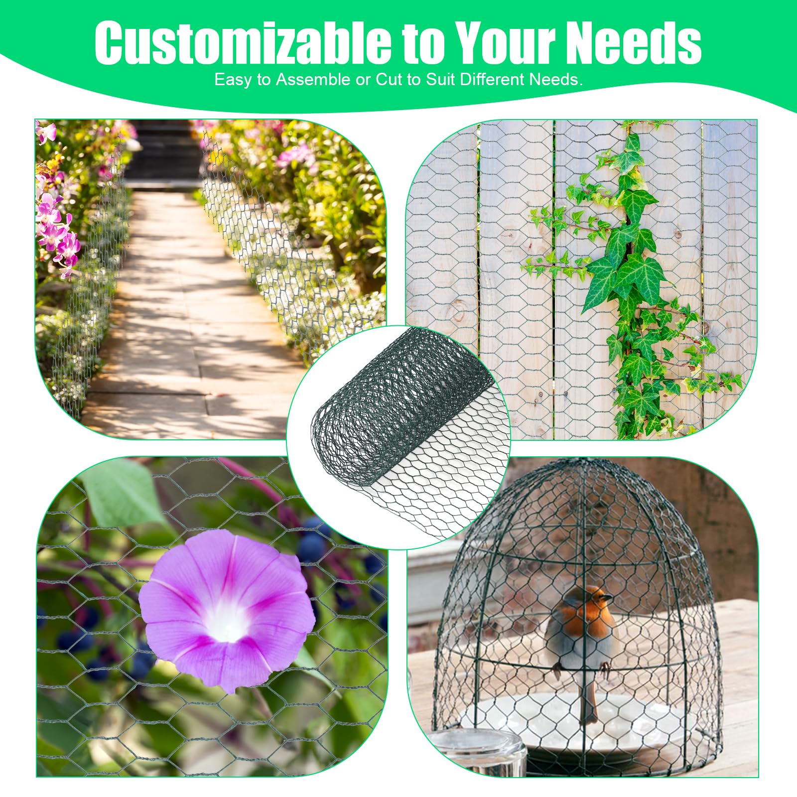 Premium Coated Chicken Wire: Our chicken wire fencing features high-quality materials with a green PVC coating on the outside and durable galvanized iron inside, providing excellent corrosion resistance and tensile strength for a longer lifespan.In addition, the chicken netting is highly flexible, allowing it to be freely folded and bent with ease.