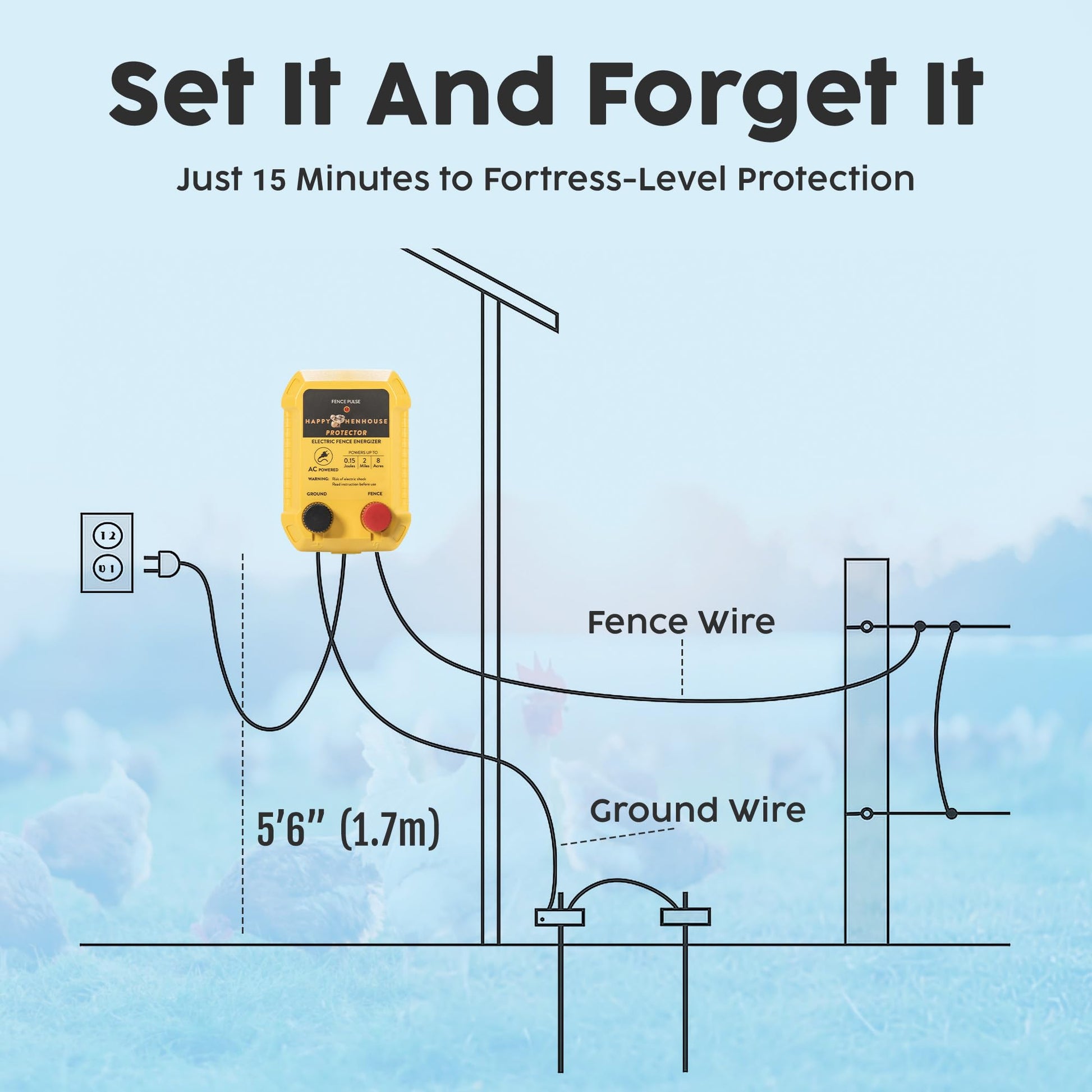 POWERFUL PLUG-IN POWER. CHICKENS SLEEP SOUND, GARDENS STAY YOURS - Steady 110V AC power runs your netting or wire fence day and night—no sun or batteries. A cost-effective alternative to solar with safe, pulsed deterrent built in.