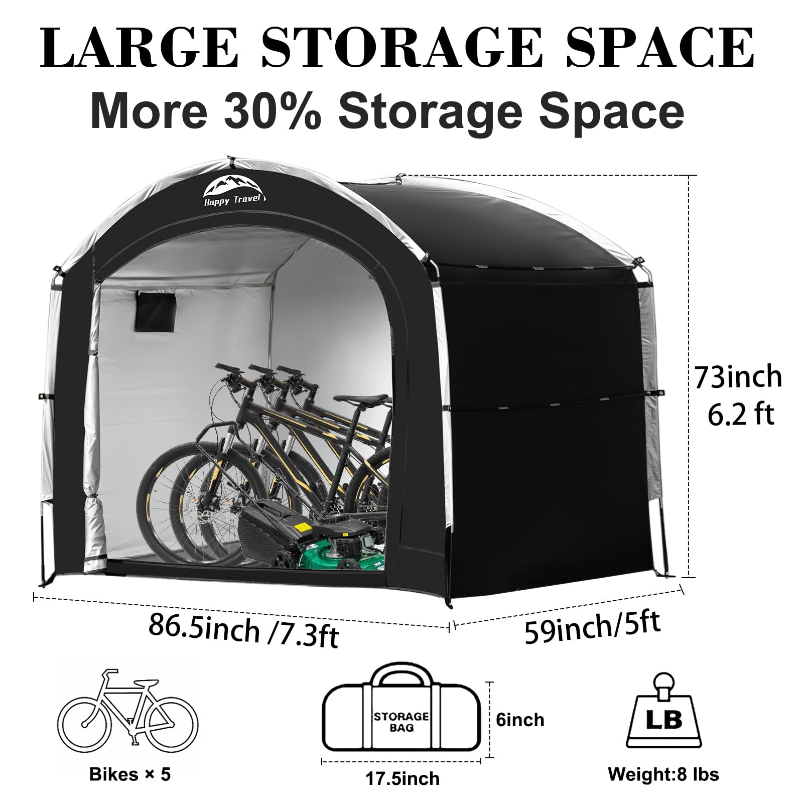 【Large Capacity Bike Shed】:The dimensions of our bike storage tent are: 86.5in x 59in x 73in. It provides a large storage space and can easily store 5 adult bikes or 2 motorcycles. And we have adopted a new design,which gives the outdoor shed more 30% storage space.