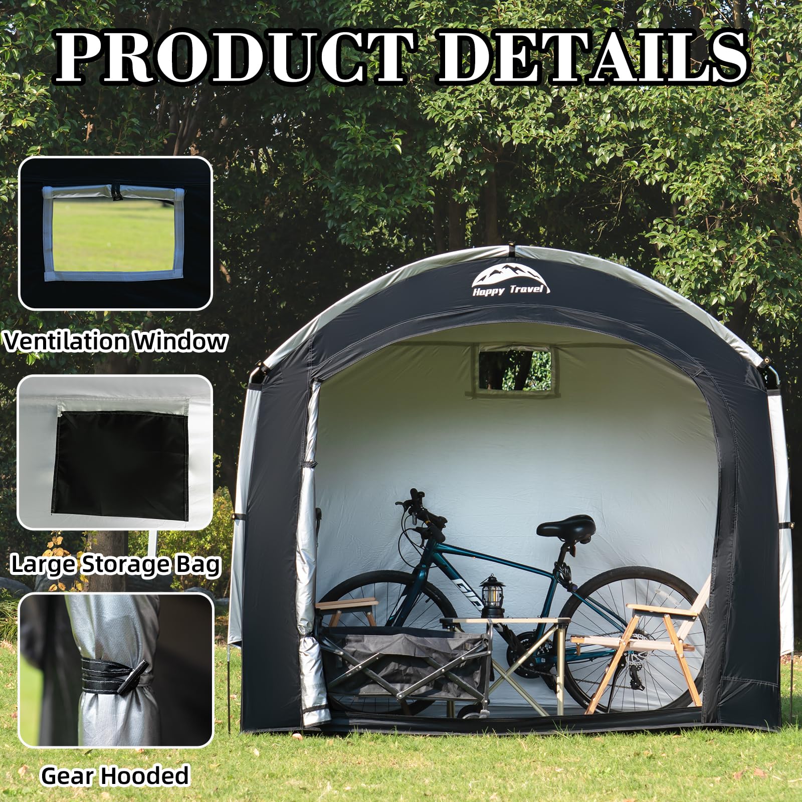 【Quick Setup & Portable Carry】:The outdoor bike cover from the perspective of user needs,so the bike shed is setup like a conventional camping tent,you only need tent pole is inserted into the tent pole cover in turn. The whole process takes about 8 minutes. The bike storage sheds outdoors with the floor are just as easy to storage,measuring 17.5*6*6 inches and weighing just 8 pounds.