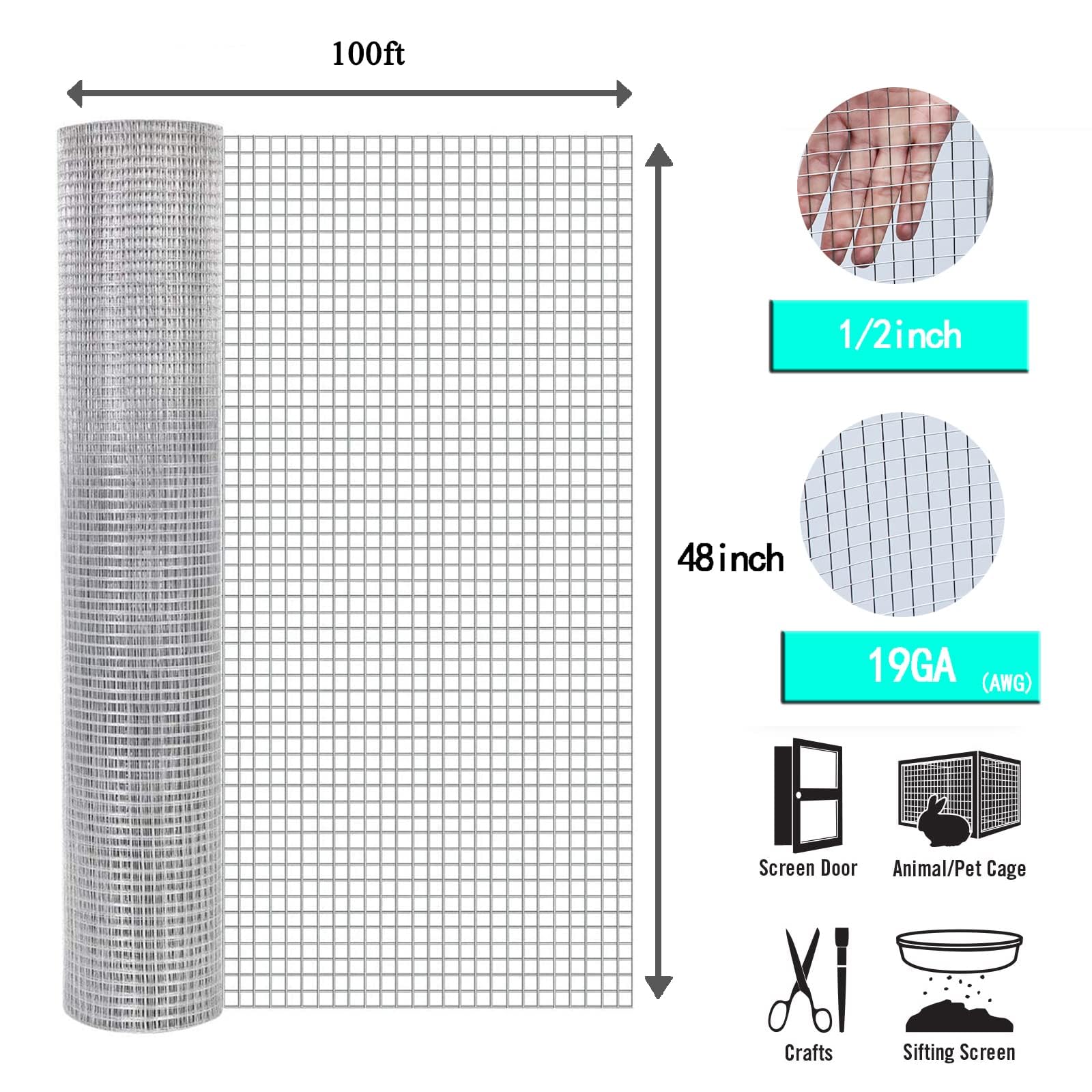 Hardware Cloth 1/2 inch 48inch x 100 Ft 19 Gauge Hot Dip Galvanized After Welding Galvanized Wire Mesh Roll Chicken Wire Fencing Gopher Wire Garden Bed Plant Supports Poultry Netting Cage Snake Fence