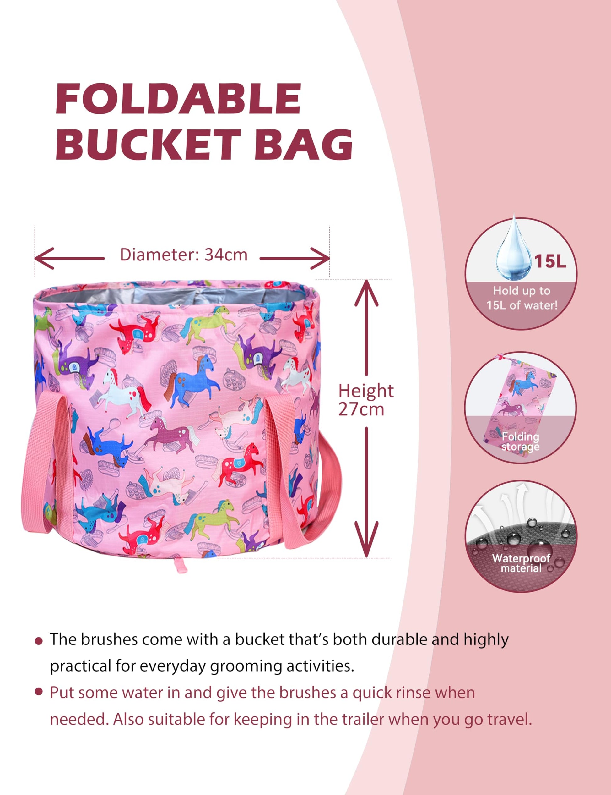 Portable Water Bucket: The horse grooming set comes with a foldable tote bag that not only neatly stores all the brushes but also doubles as a mobile water bucket. This convenient feature allows for quick cleaning of brushes or your horse, eliminating the need to carry a separate bucket for on-the-go grooming.