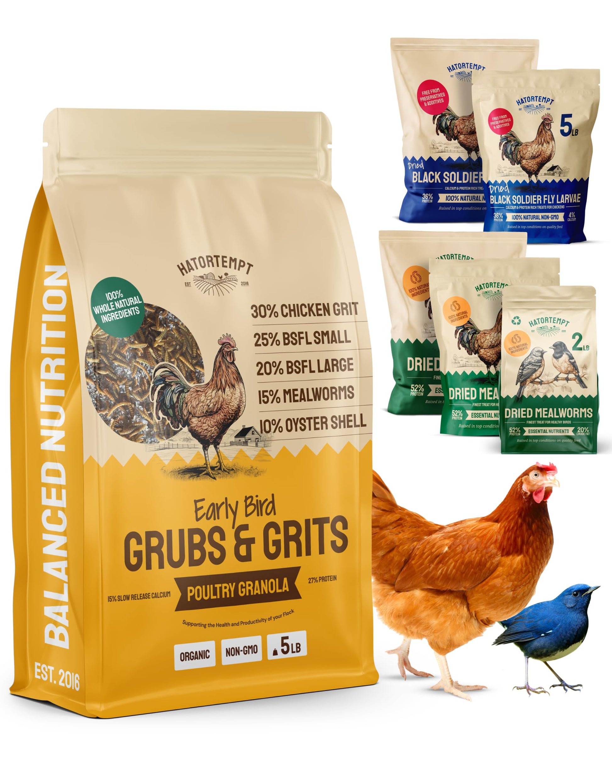 Hatortempt 5lb Grubs & Grits Organic Chicken Feed - 3 Grub Blend with Oyster Shells & Grits - Dried Mealworms for Chickens Plus Large & Small Black Soldier Fly Larvae - Food Designed for Foraging