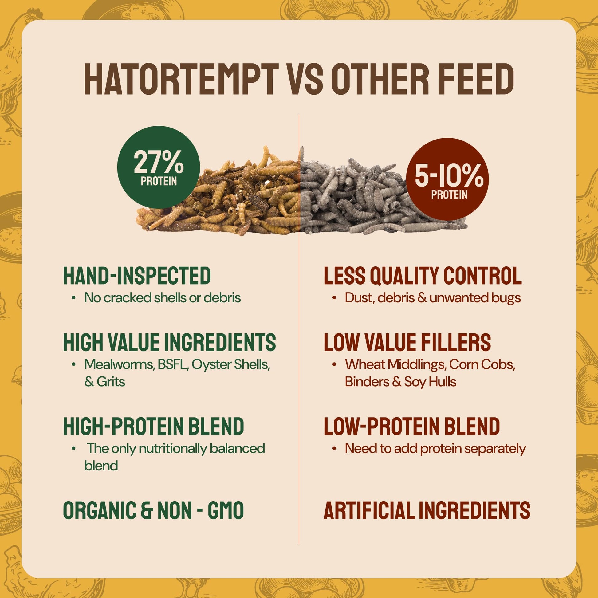 Hand Inspected Quality Control: Like all of Hatortempt's treats for chickens, the grubs in our Grubs & Grits are hand inspected. This prevents any debris or dirt from reaching your chick food, giving you the plump, crispy & whole worms your ladies deserve
