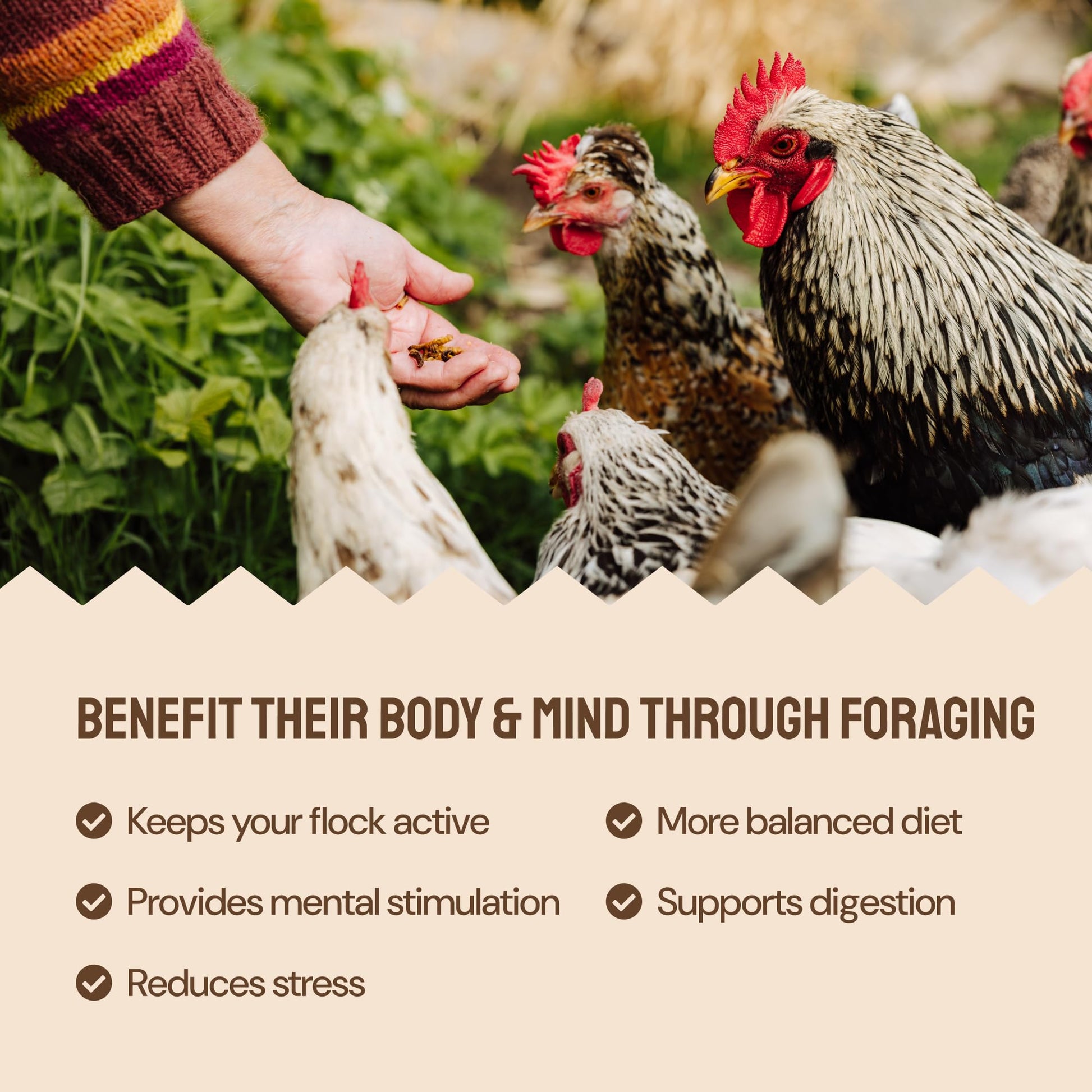 Made for Foraging: With it's blend of chicken mealworms & BSFL, our high protein chicken feed is made to be scattered & foraged. No planting needed, this mix keeps your flock active, reduces stress, & provides the nutrients they would naturally forage for