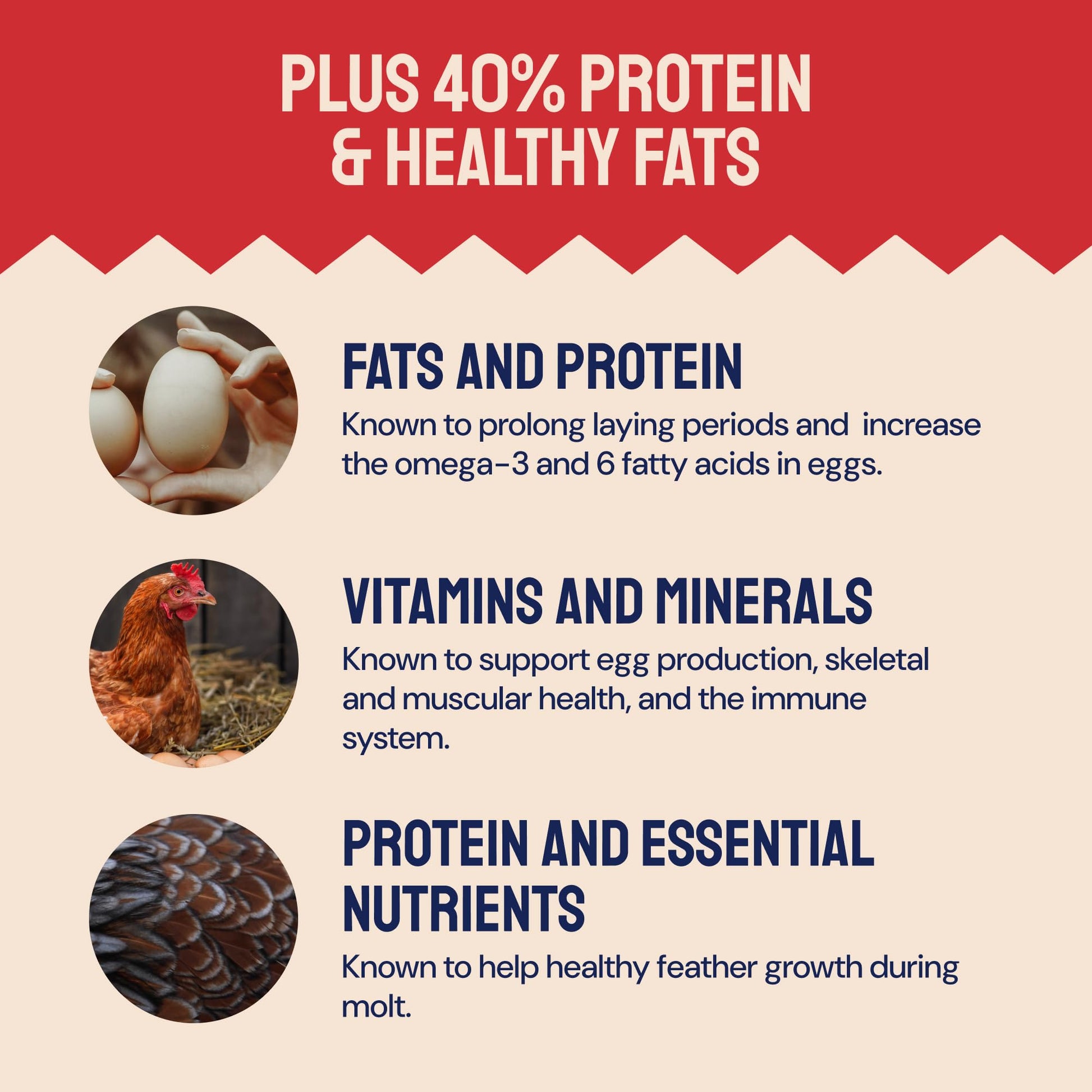 Nutritious Snack Alternative: These larvae are a fantastic swap for worms for chickens, offering more calcium and protein to keep your birds thriving. Mix them into your chicken's diet for a tasty, non-GMO organic grubs for chickens they’ll love