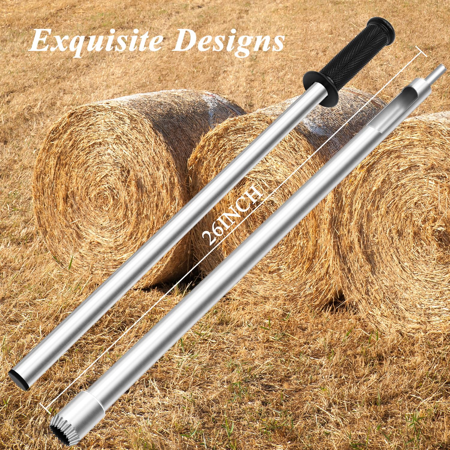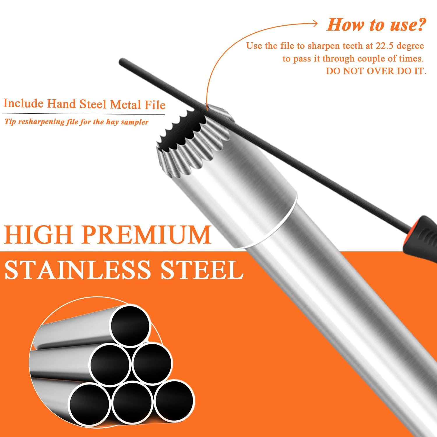 Hay probe Bale Sampler Kit: Our package includes 26 inch Hay probe Bale Sampler with serrated tip (wider tip will decrease friction on the hay probe), stainless steel hay core probe plunger and a metal file for resharpening the tip.