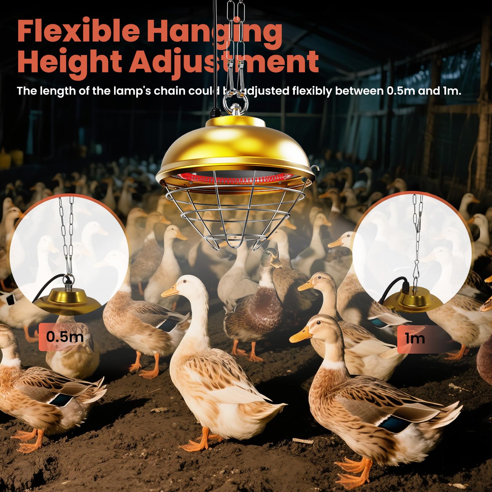 Flexible Installation: Comes with an adjustable chain (0.5m–1m) and 5.58 ft UL-certified cord for safe setup. Easy to use as a coop heater, chicken house heater, or heat lamp for ducks in small or large enclosures