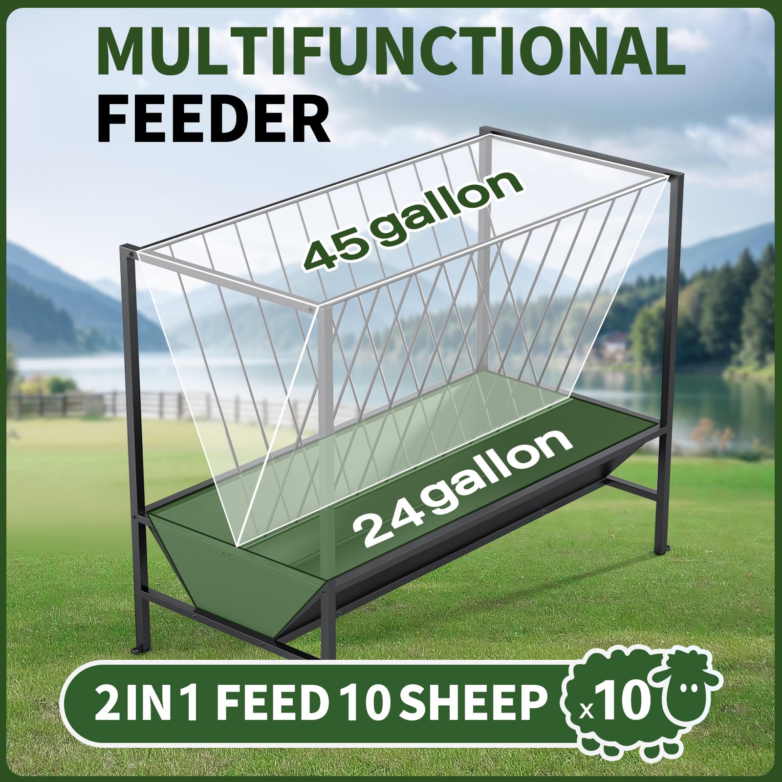1.Large Capacity Dual Compartment Design: This hay feeder for goats features a 45-gallon top rack and a 24-gallon feed pan, allowing your animals to graze freely while ensuring consistent access to nutrition.