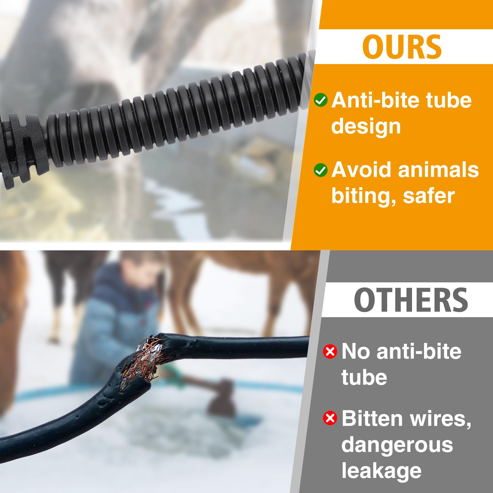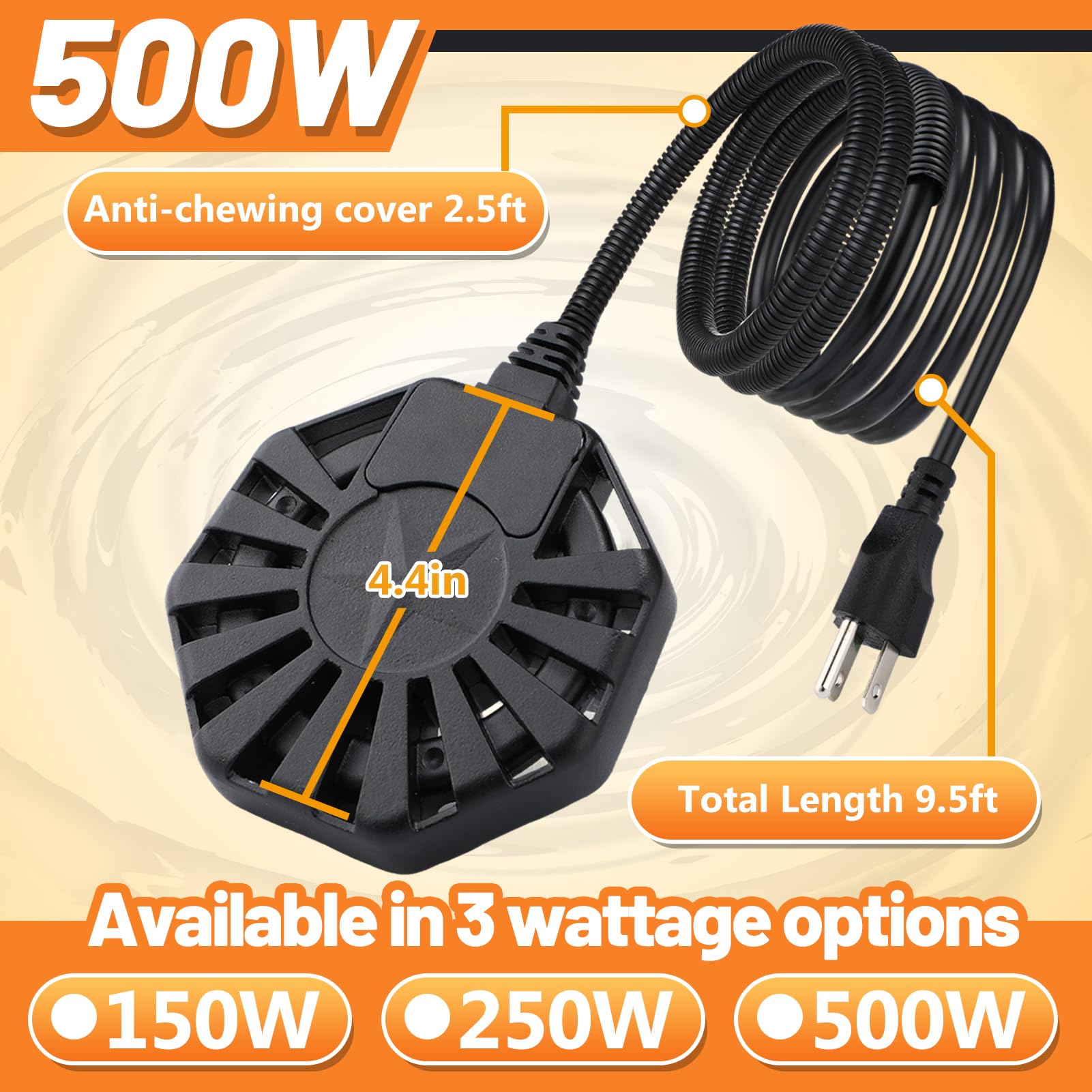 【Widely Applicable】We have three different wattage outdoor livestock water de-icers for you to choose from: 150W for up to 10 gallons, 250W for up to 25 gallons, and 500W for up to 50 gallons for sinks and baths. Among them, the 500W de-icer is ideal for de-icing outdoor watering troughs for larger animals such as horses, cows, sheep, and large dogs.