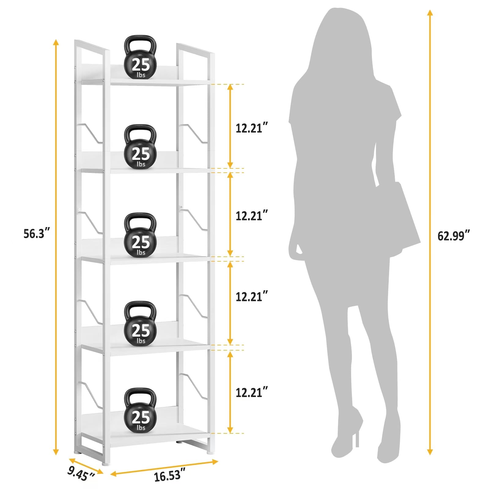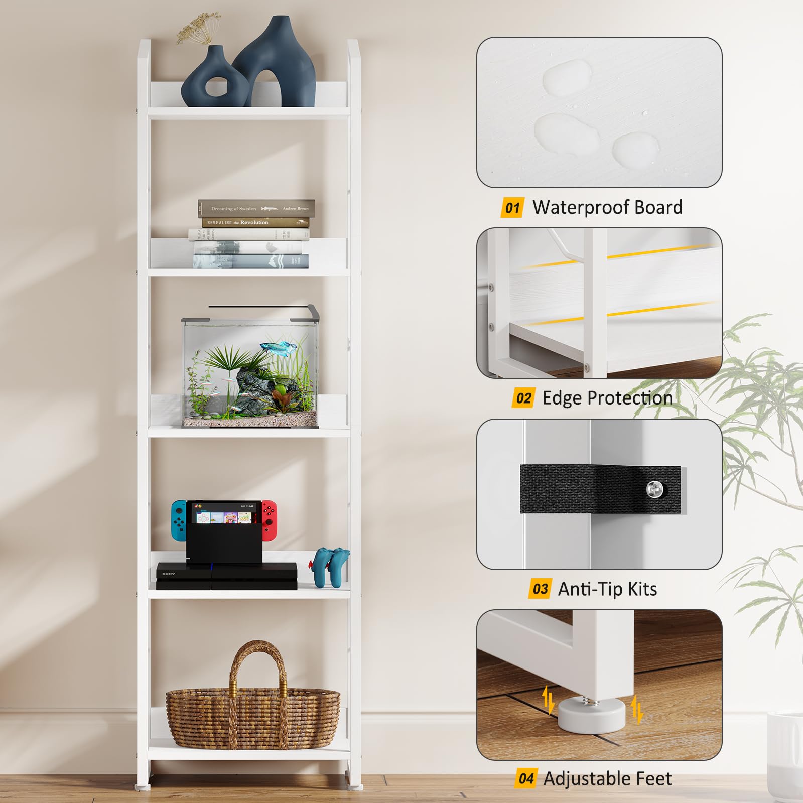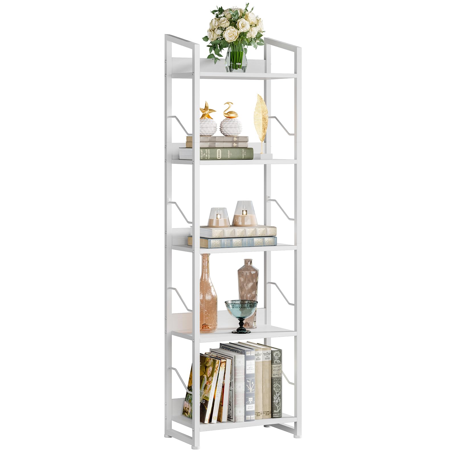 Hosfais Book Shelf Small Bookshelf: 5 Tier Wood Bookcase Industrial Bookshelf with Edge Protection Metal Narrow Bookcase Storage Organizer Display Rack for Bedroom Home Office, White