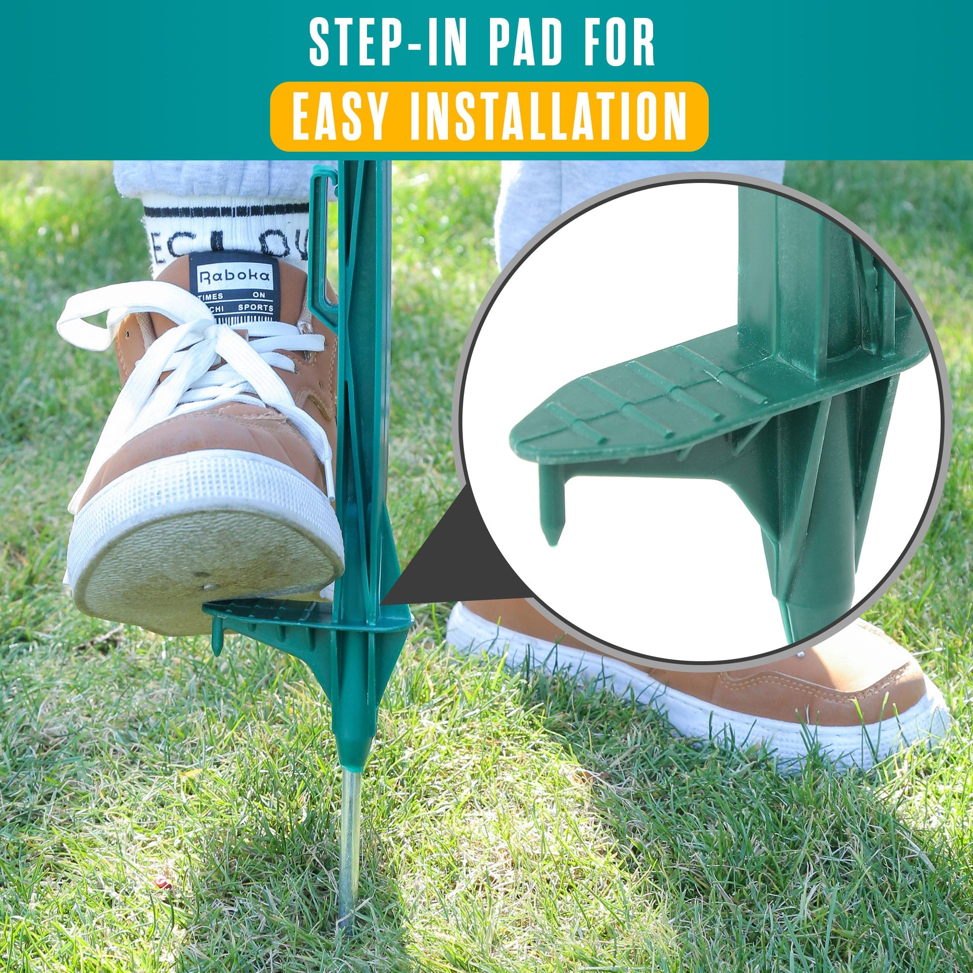 STEP-IN INSTALLATION - Our step in posts feature a step-in tab design that allows for a quick and easy installation. Additionally, the tab's integrated stake at the bottom enhances stability, effectively preventing the fencing post from rotating.