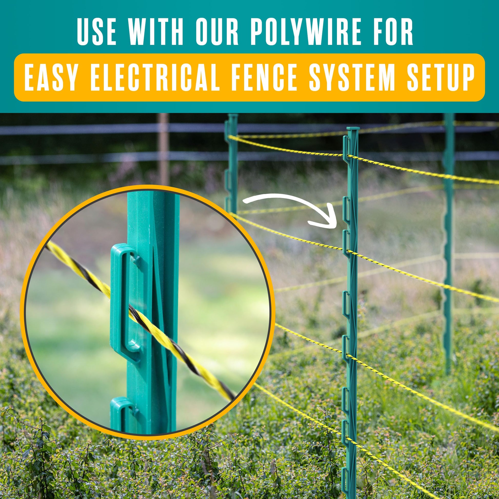 VERSATILE USE - The hook design of the green fence post allows for compatibility with a diverse array of fence types, including electric polywire, poly tape, and various other temporary fencing types.