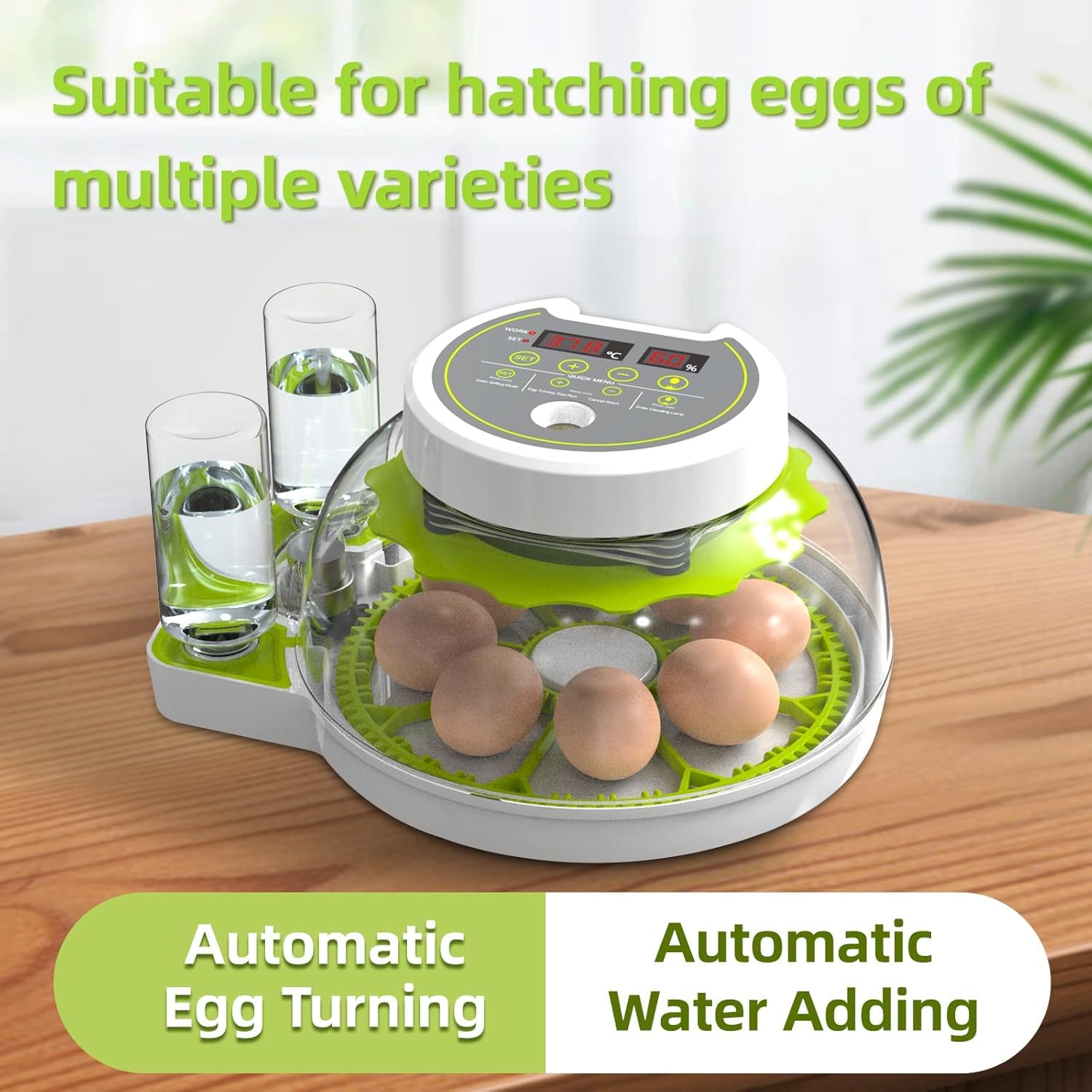 AUTOMATIC EGG TURNING AND WATER ADDING - Automatic egg turning every 120 minutes/time, equipped with automatic water filler, you can adjust the number of water bottles to control the humidity.