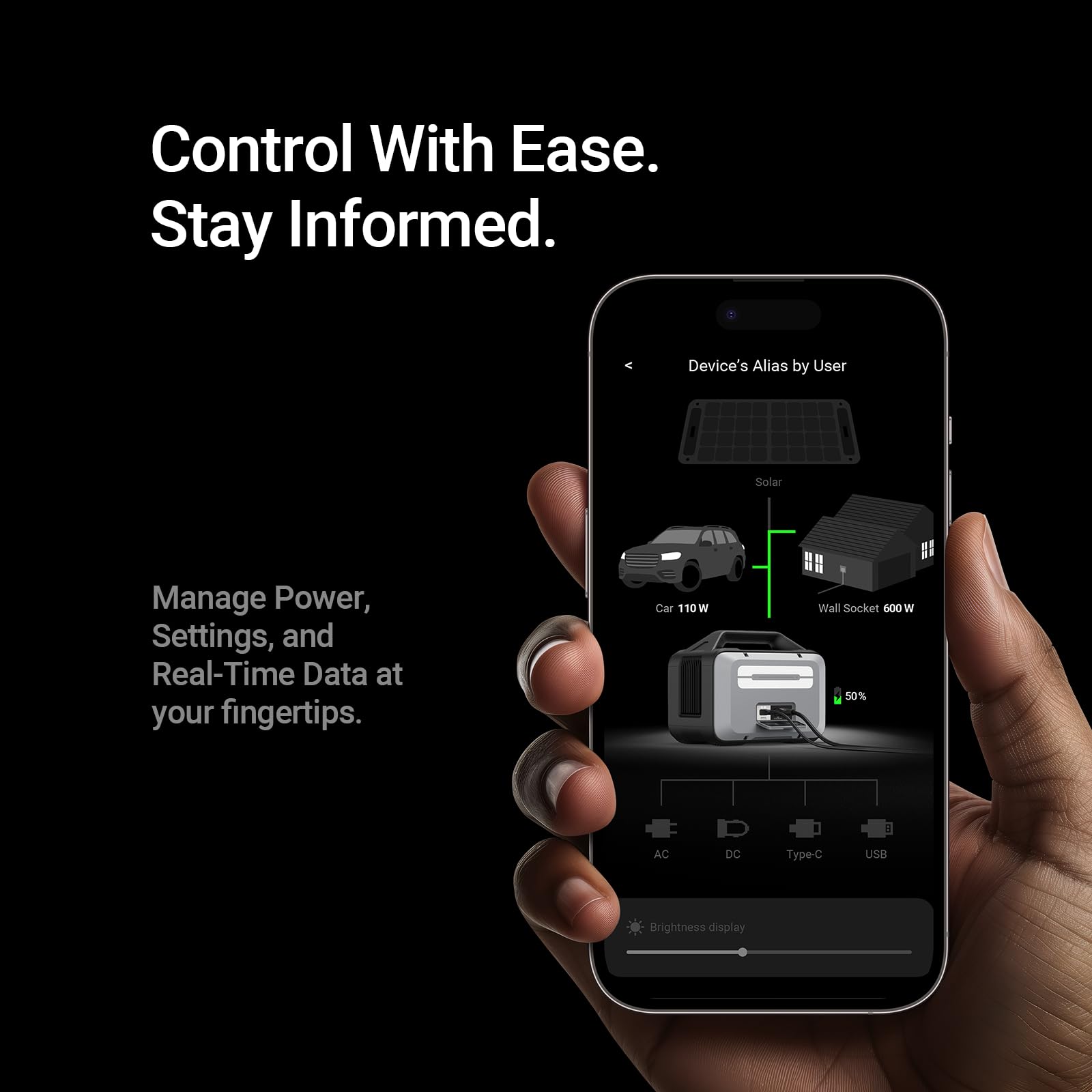 [Every Touch, Considered.] Touch-light dimming, silicone grip handle, sealed dust cap—thoughtfully built for comfort, safety, and life with your outdoor generator.