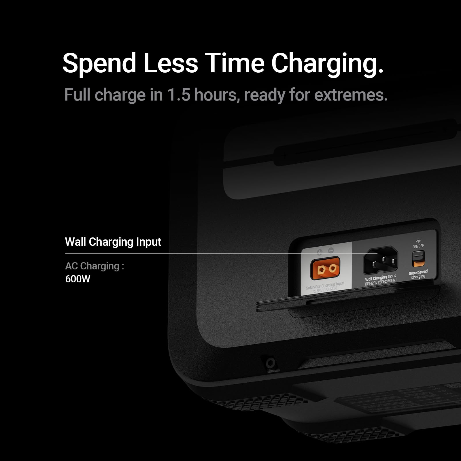 [Recharge 80% in 1 Hour] Need power—fast? This battery bank reaches 80% in just 1 hour via 600W AC. Off-grid? Go solar (400W) or charge on the move with 24V car input.