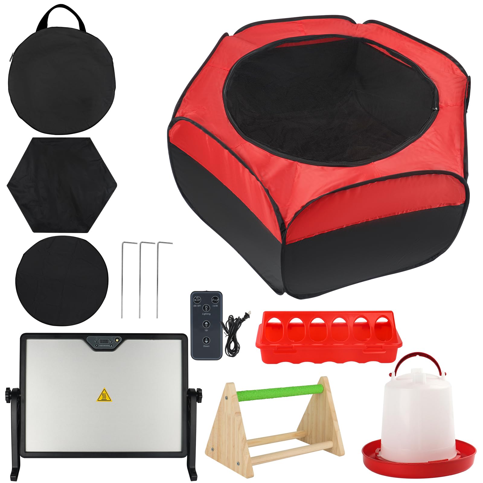 [EASY TO USE] - This space-saving brooder is designed for hassle-free storage and transport, perfect for homes with limited space or for on-the-go poultry keepers. Quick-setup design requires no tools or complex assembly - simply unfold and use! The complete kit includes 3 ground pegs for outdoor stability and conveniently folds down to fit in the included compact storage bag