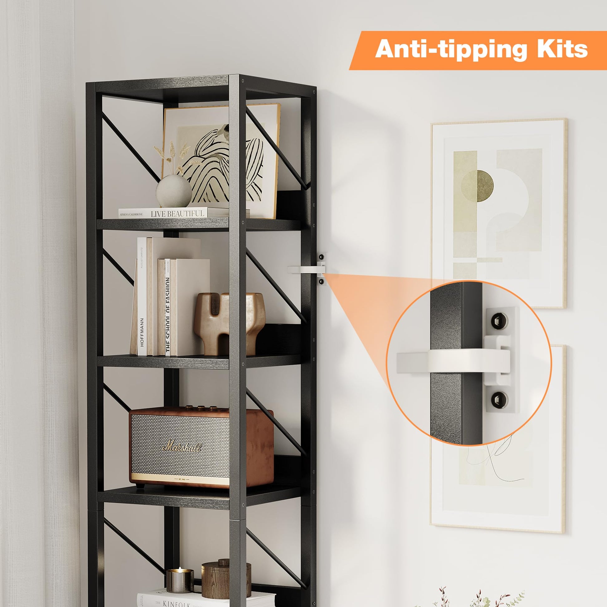 Durable Material & Solid Construction: Thanks to the high-density MDF board and well-structured metal frame design, this tall bookshelf can withstand the challenge of long-term use. What's more, the extra-shaped sidebar and anti-tipping straps enhance the security and stability of this bookcase to hold up to 25 pounds per shelf. adjustable feet can keep the unit level on uneven flooring and protect the ground from scratches.