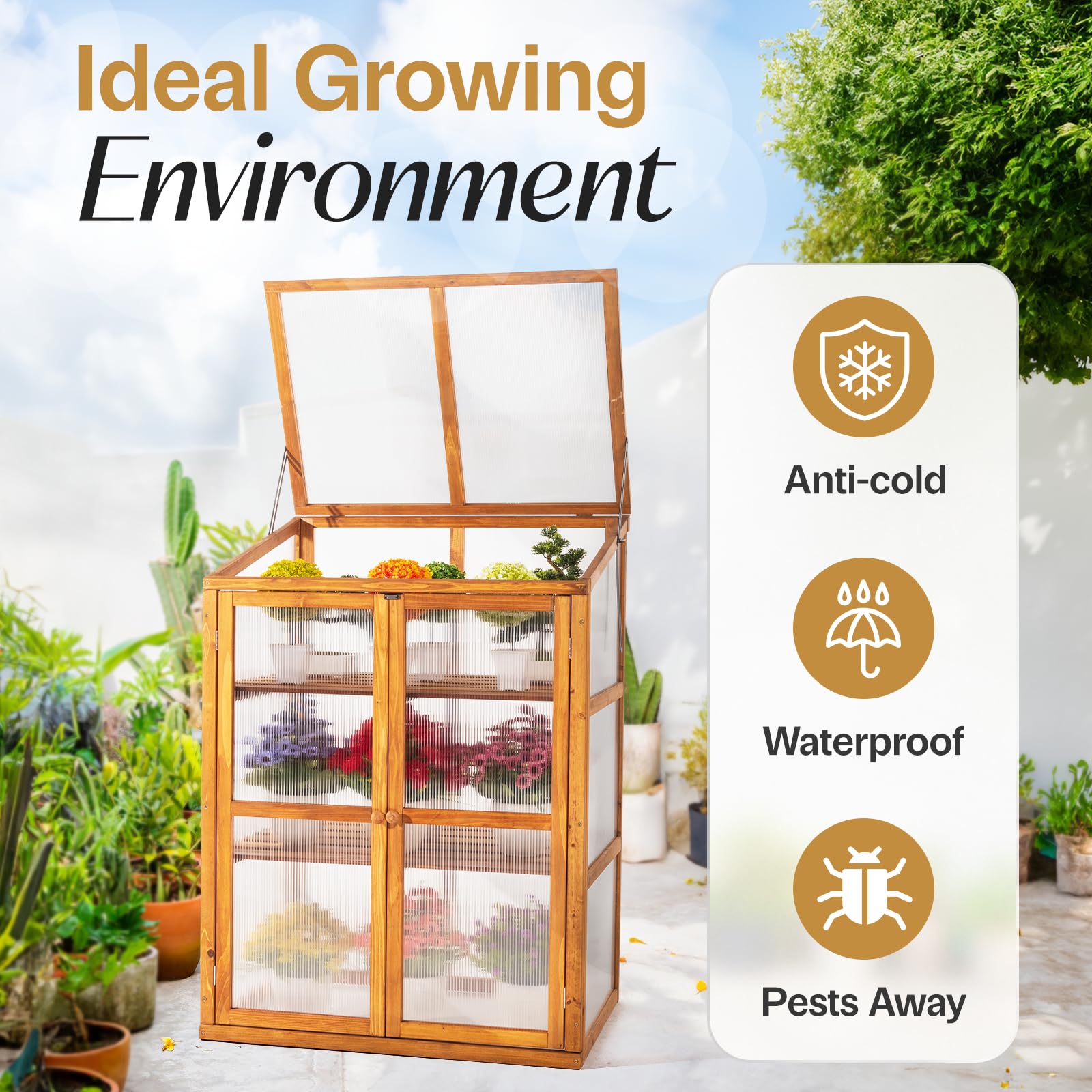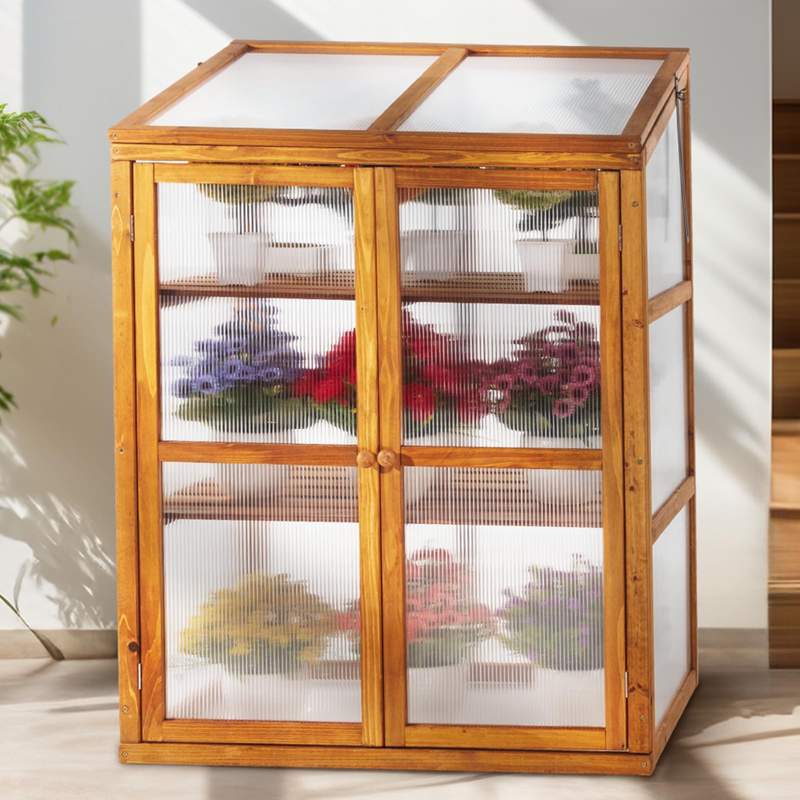 IDZO Fir Wood Cold Frame Greenhouse for Outdoors, 2-Tier Greenhouse Cabinet with Transparent Polycarbonate Sheet & Foldable Top Creates an Ideal Environment for Various Plant Growth, Easy Assembly