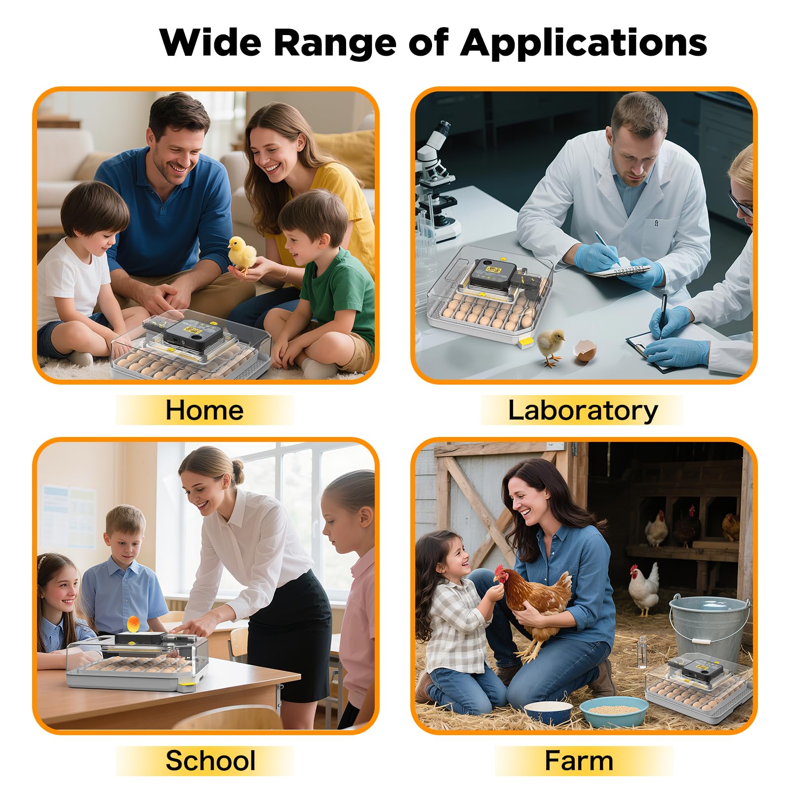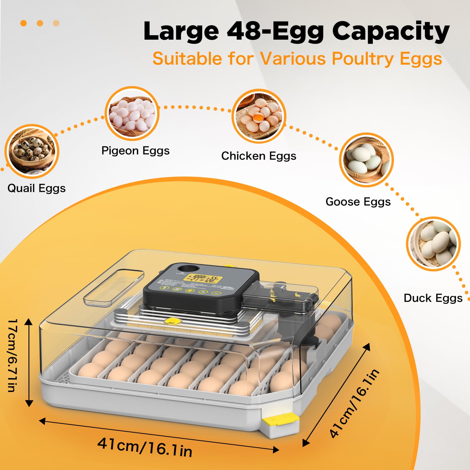 Large Capacity: The advanced incubator can accommodate 48 eggs, compatible with chicken, duck, goose, quail, pigeon eggs. Suitable for homes, farms, classrooms, and labs. Adjustable egg frame and capacious brooding area make it is perfect for hatching various egg types