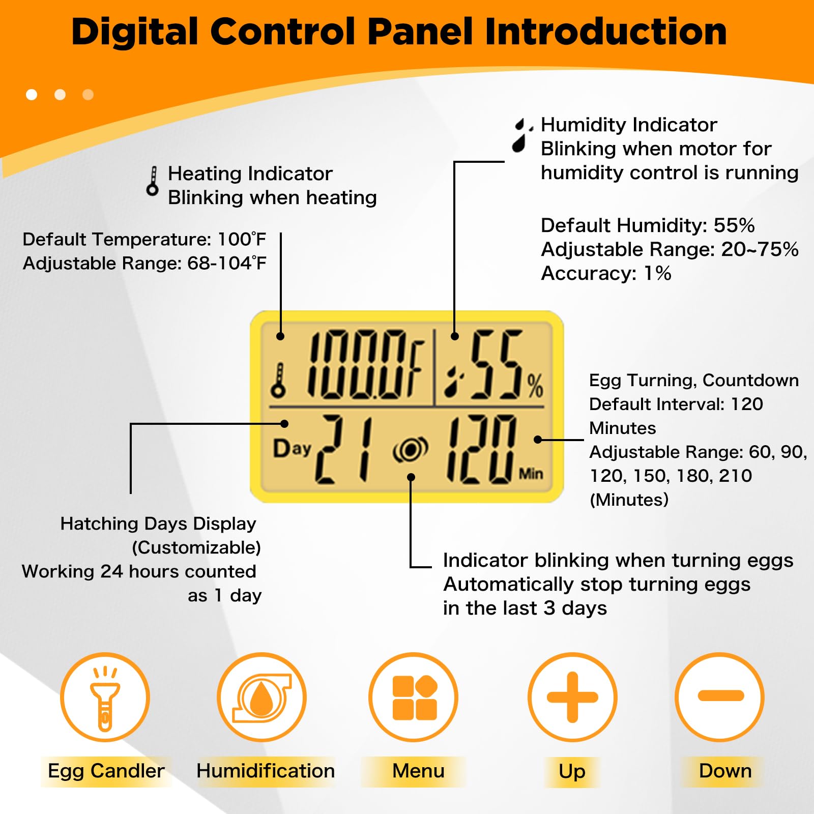 User-Friendly Operation: The egg incubators feature LCD display screens that enable easily monitoring and adjustment of temperature, humidity, incubation days, and turning countdown. The incubator's detachable design makes cleaning easy, just take out egg frame, the grid and card strips to wash, and wipe the machine cover and circuit components clean