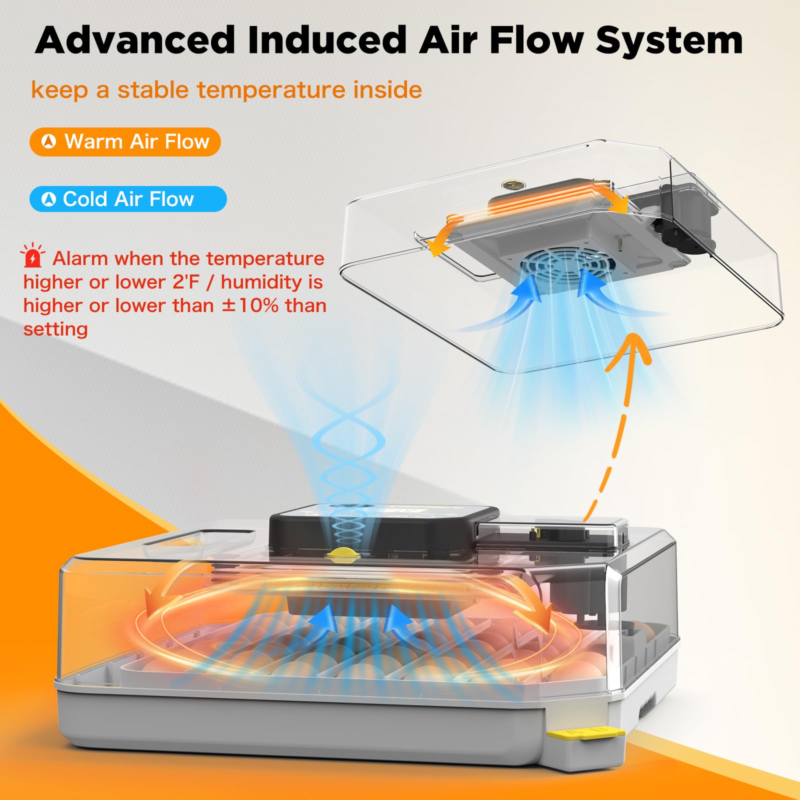 Leading Control Technology: Innovative 2-in-1 humidity control system and adjustable air vent provide more flexible and precise humidity management, providing the best incubation environment for the eggs. Smart alarm system promptly alerts to any temperature or humidity anomalies, ensuring safe incubation