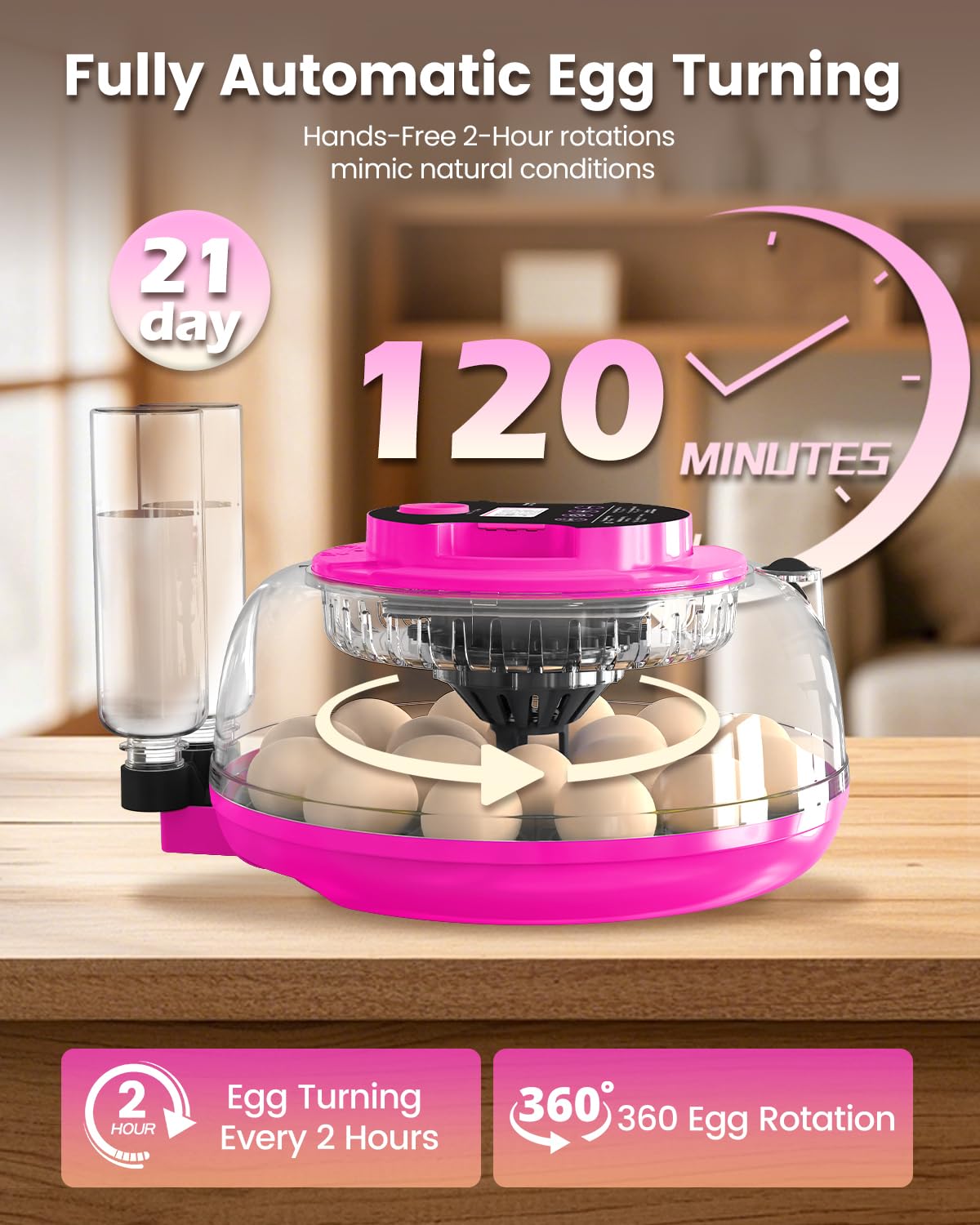Automatic Egg Turner for Better Hatch Rate: This 18-egg incubator features an auto egg-turning system that simulates natural hen behavior. It rotates eggs regularly to improve embryo development and increase the hatch success rate. The system automatically stops turning four days before hatching for optimal results.