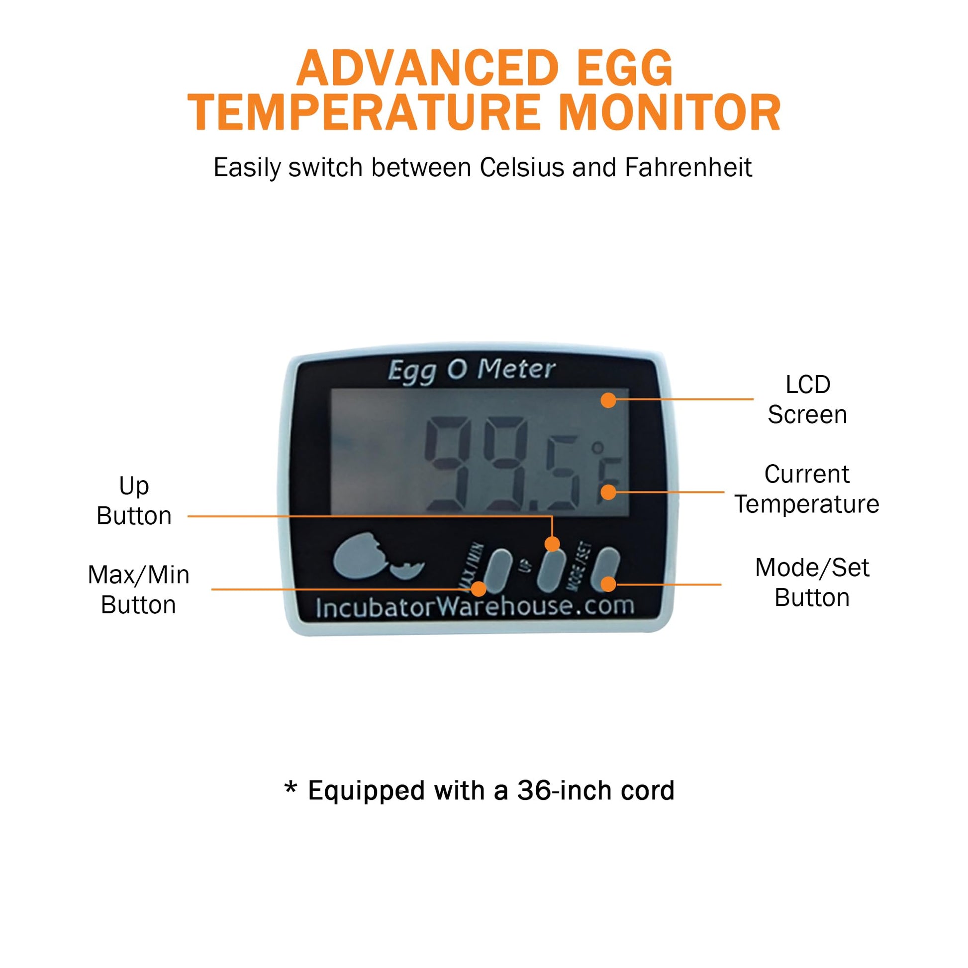 ππππ ππππ ππππ πππ πππππππ: With a 36-inch cord, the Egg-O-Meterβs large LCD screen can be positioned conveniently outside the incubator while still monitoring egg temperatures. This setup allows for easy visibility and monitoring without needing to open the incubator, which can disrupt the internal environment.