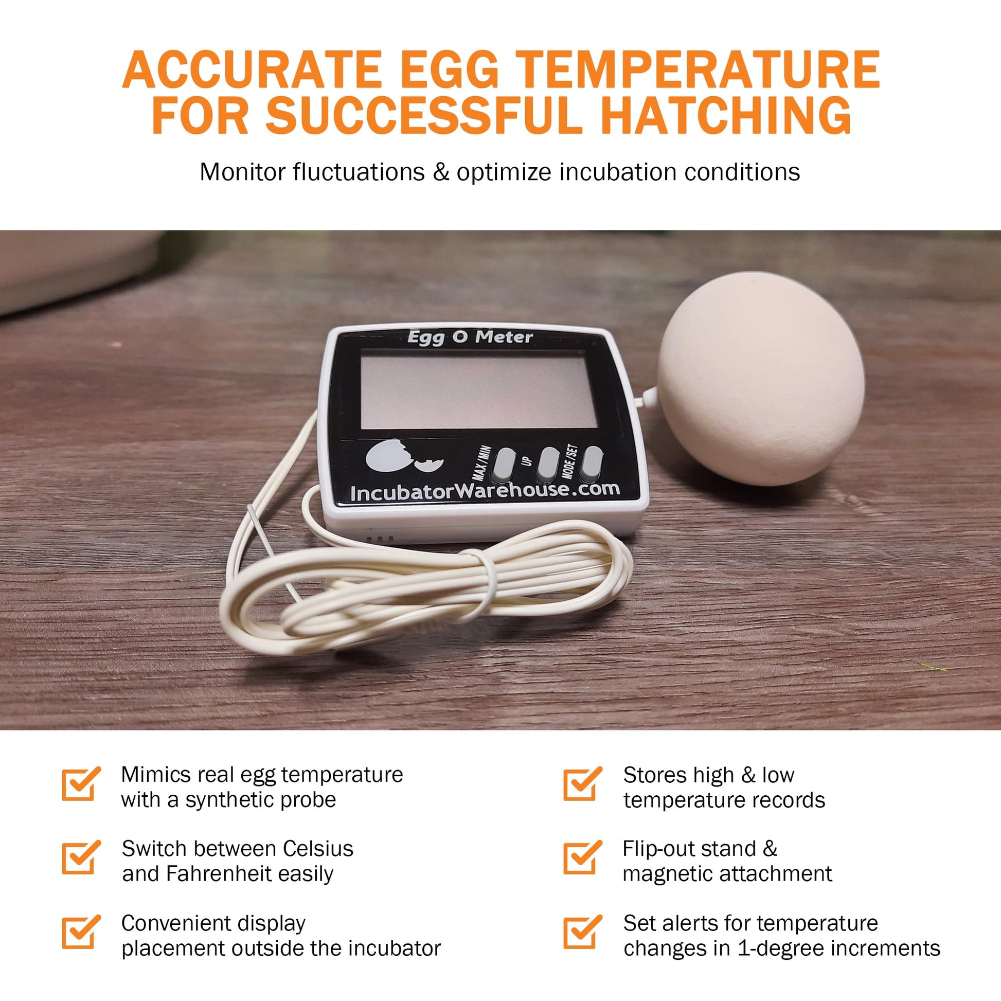 ππππππππ πππ πππππππππππ πππππππππππ: Unlike traditional thermometers that only measure ambient air temperature, the Egg-O-Meter accurately measures the temperature inside the egg itself. This precision is important because it ensures the developing embryos are kept at the ideal temperature for optimal hatching success.