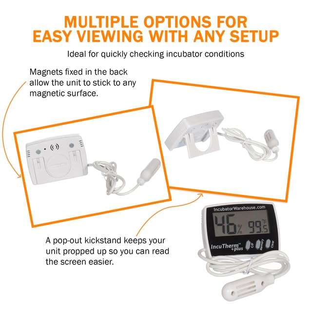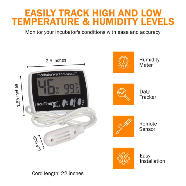 Incubator Warehouse IncuThermβ’ Plus Digital Thermometer and Hygrometer for Egg Incubator - Large Digital Display with Min/Max Memory - Remote Probe - Reads Celsius and Fahrenheit +/-1Β° 1109 IWTH01