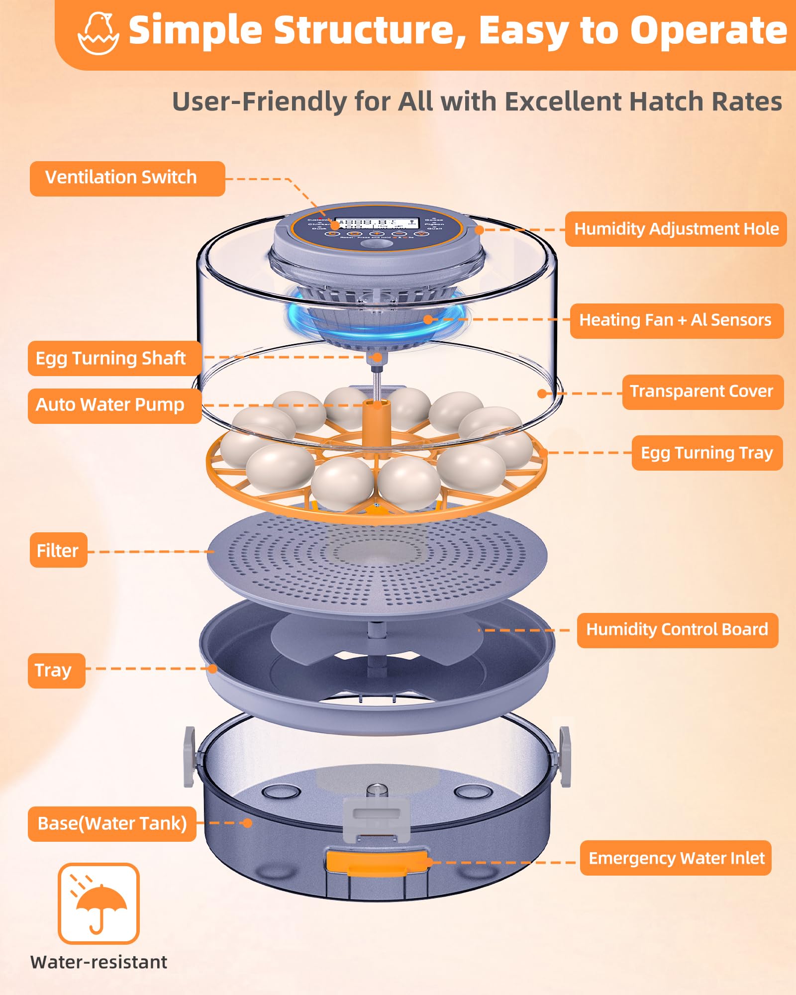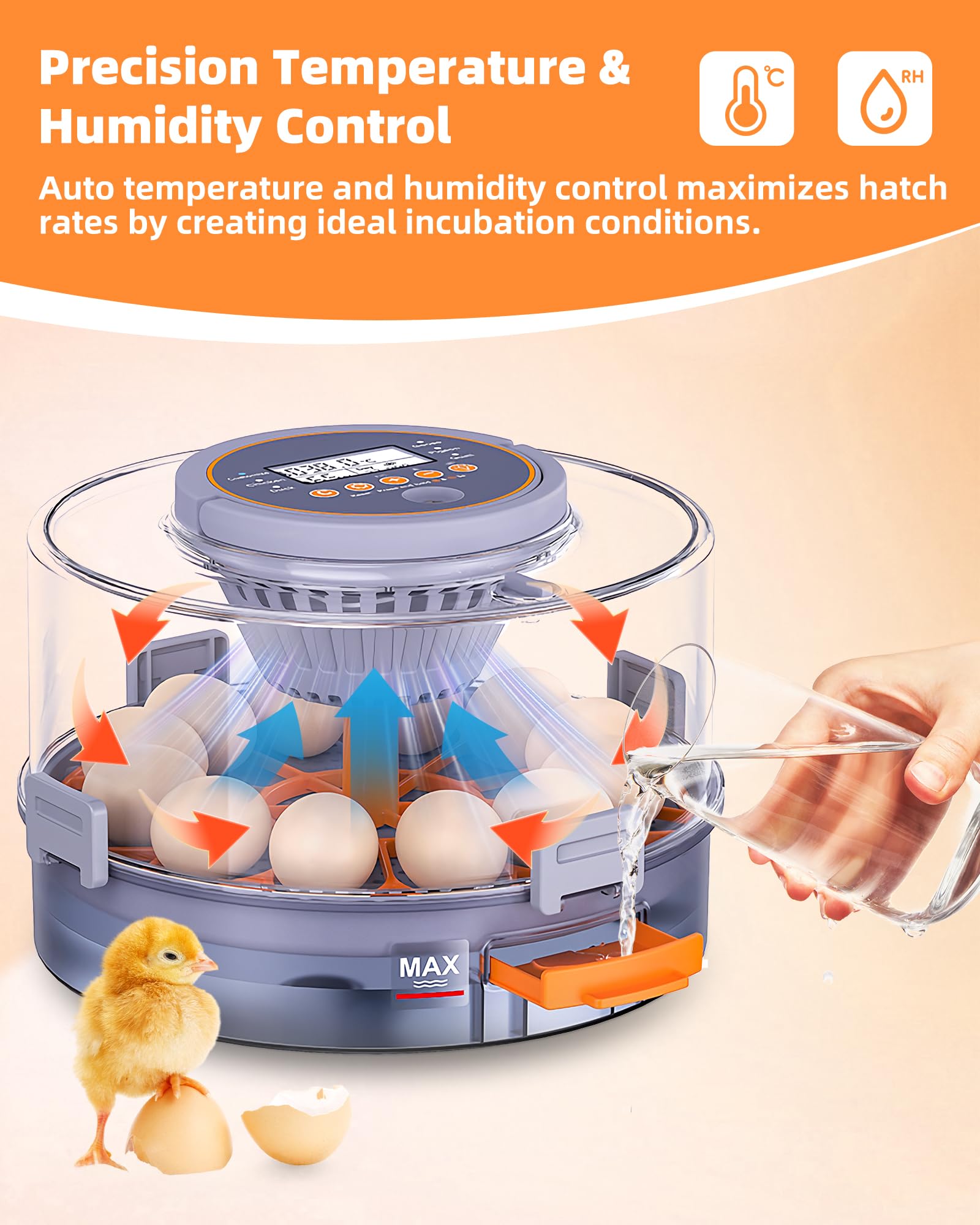 ใ๐๐ฎ๐ญ๐จ ๐๐ฎ๐ฆ๐ข๐๐ข๐ญ๐ฒ ๐๐จ๐ง๐ญ๐ซ๐จ๐ฅ - ๐๐๐ฌ๐ฒ ๐๐๐ญ๐๐ซ ๐๐๐๐ข๐ฅ๐ฅ ๐๐จ๐ซ ๐๐ญ๐๐๐ฅ๐ ๐๐จ๐ข๐ฌ๐ญ๐ฎ๐ซ๐ใ- The egg incubators for chickens features a built-in removable water tank that slides out for easy refilling. Automatically maintains proper humidity levels to prevent moisture loss from eggs.