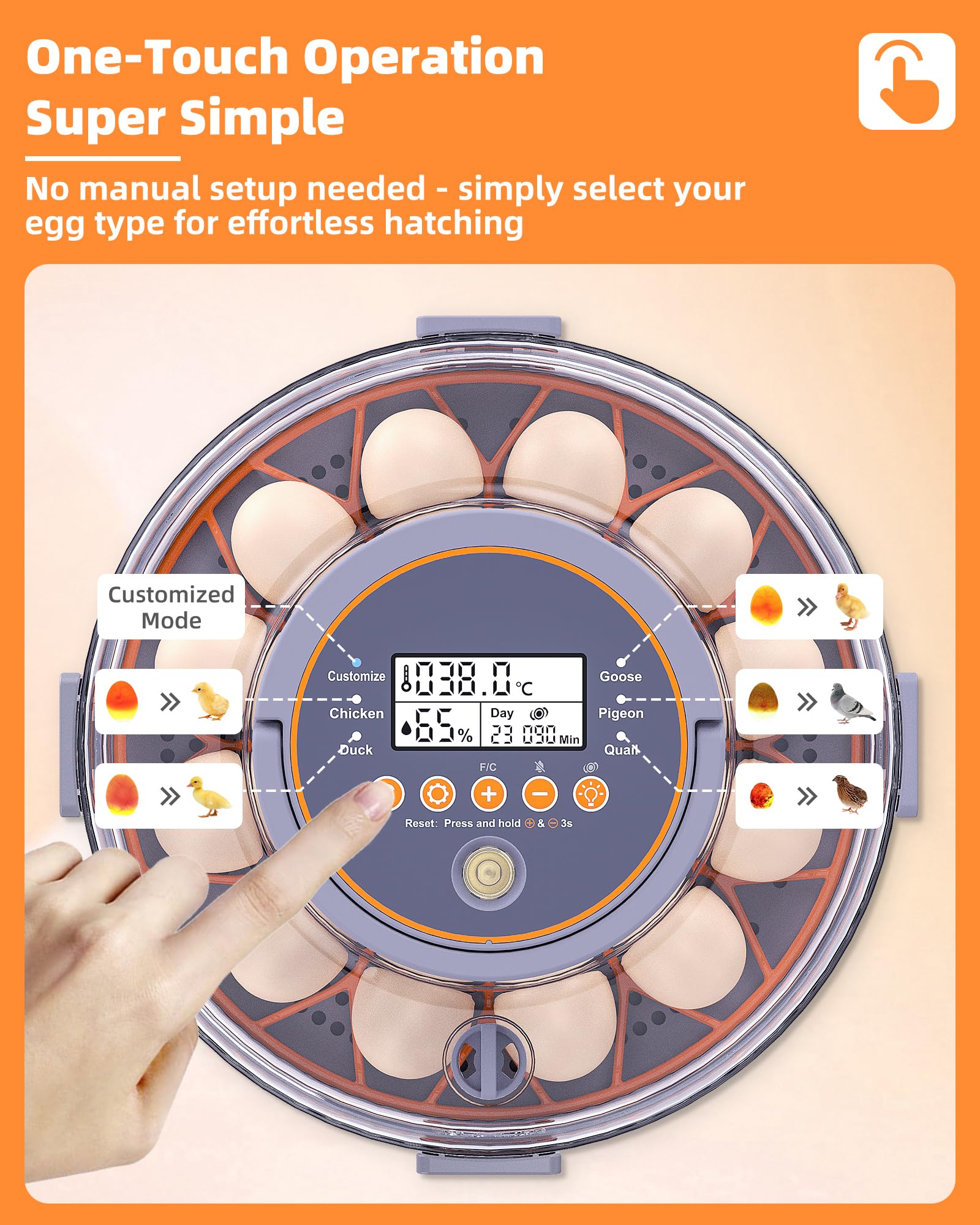 ใ๐๐ง๐-๐๐จ๐ฎ๐๐ก ๐๐ฉ๐๐ซ๐๐ญ๐ข๐จ๐ง - ๐๐ฎ๐ฉ๐๐ซ ๐๐ข๐ฆ๐ฉ๐ฅ๐ - ๐๐ฎ๐ฌ๐ญ ๐ฉ๐ฅ๐๐๐ ๐๐ ๐ ๐ฌ ๐๐ง๐ ๐ฌ๐๐ฅ๐๐๐ญ ๐ฆ๐จ๐๐ใ- With 5 Smart Incubation Modes + 1 Manual Mode - Simply select your mode, and the chicken incubators for hatching eggs automatically adjusts optimal temperature, humidity, turning frequency and duration for different bird eggs - saving time and effort.