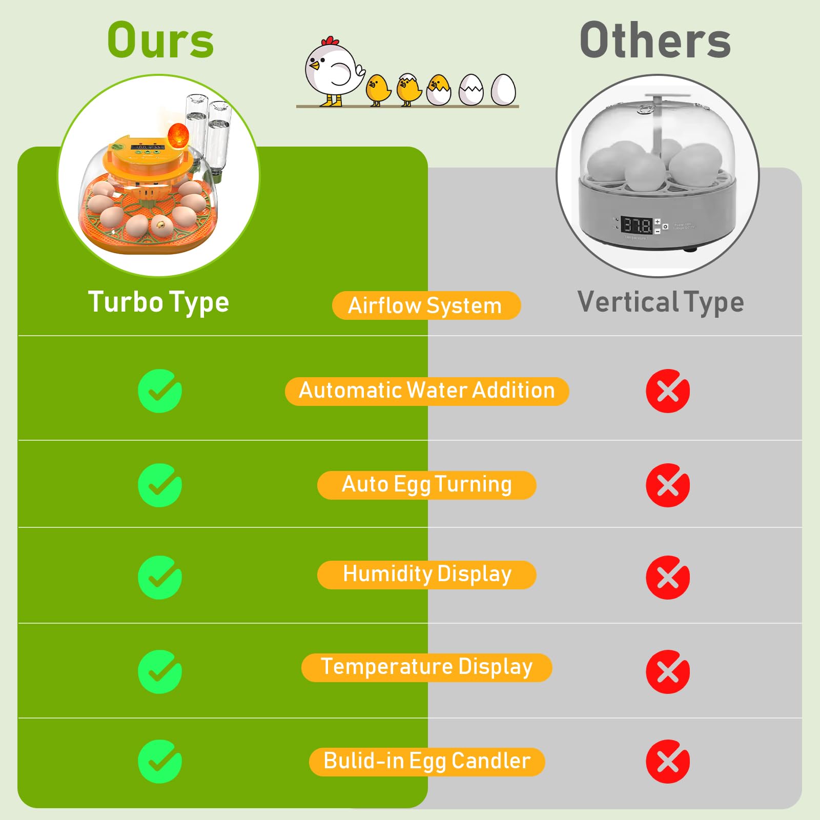 Upgraded Smart Egg Incubator: Temperature and humidity display for precise monitoring. The 2-in-1 humidity control system and adjustable vent enable flexible humidity management. The built-in fan maintains stable airflow and temperature for optimal egg hatching, creating the best incubation environment.