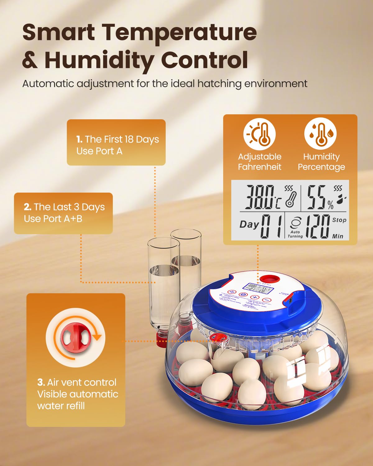 đăEasy to Use & MonitorăThe incubator user-friendly design with LED display showing temperature, humidity, incubation days, and turning time. Built-in egg candler and a transparent lid offer 360° visibility, making it ideal for beginners and family educational activities.