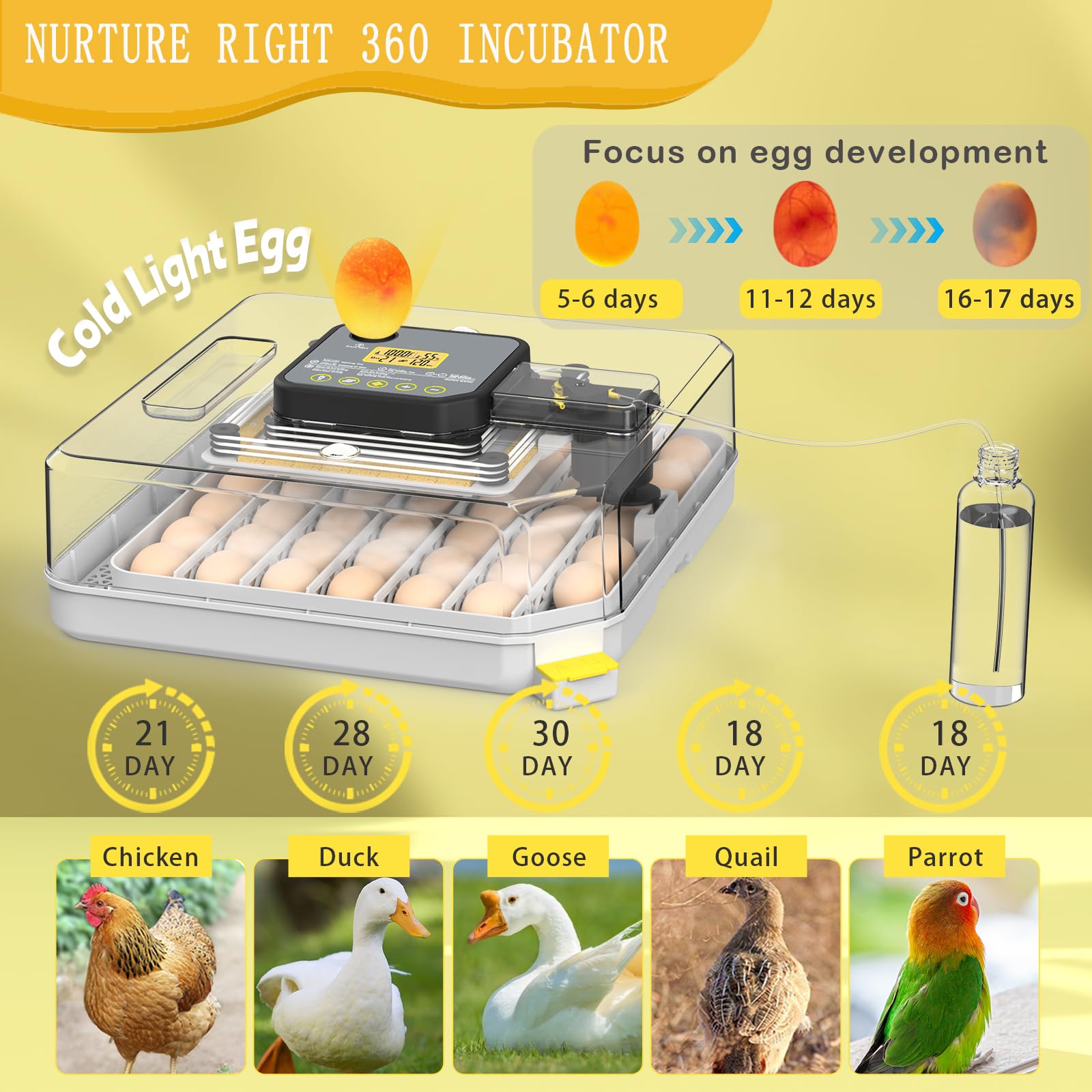 360 ° visual and user-friendly design: The quail egg incubator transparent top cover and enlarged digital screen display real-time hatching progress, temperature and humidity levels, and the number of days remaining. egg candler is a Led cold-light irradiated, non-injurious fertilized chicken eggs for hatching, duck egg incubator conveniently allows you to monitor embryo development without opening the lid